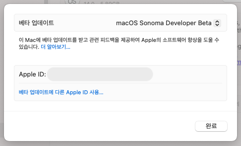 뜨는 창에서 베타 업데이트 옆의 '끔'을 눌러서 macOS Sonoma Developer Beta로 바꿔 줍니다.