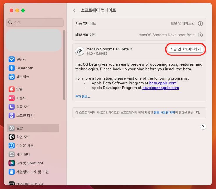 완료를 누르면 창이 닫히고, 잠시 로딩이 되고 나서 macOS Sonoma Beta로 업그레이드하는 메시지가 뜹니다. '지금 업그레이드하기'를 누르면 알아서 업데이트됩니다. 몇 시간 정도 걸리니 천천히 놔두시면 됩니다.