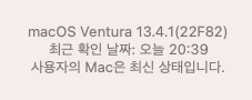 맥에 설치되어 있는 macOS 버전은 공식 최신인 Ventura(벤츄라)여야 합니다. 설정 - 일반 - 소프트웨어 업데이트에 들어가서 아래처럼 macOS Ventura 13.4.1이라고 표시되어 있으면 됩니다.