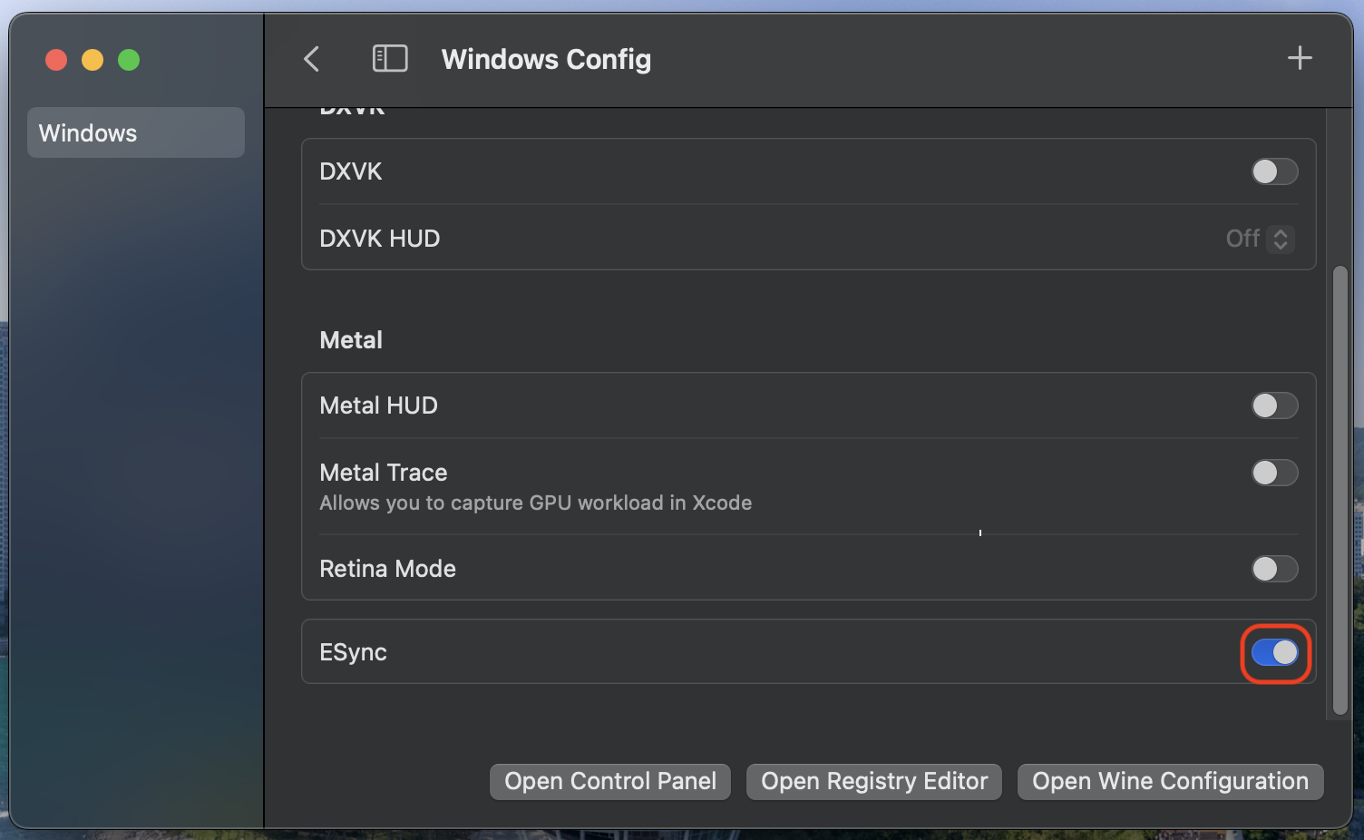이외 게임들의 경우, Whisky 창에서 Config 메뉴로 들어가 DXVK나 Esync 설정을 변경하며 테스트해 보시기 바랍니다. 특히 DirectX 12가 아닌 11, 10, 9을 사용하는 예전 게임들은 DXVK 설정을 켜면 실행되는 경우가 많습니다.