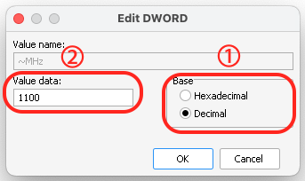 Enter DWORD 창에서 오른쪽 아래를 Decimal로 바꾼 뒤, 왼쪽 창의 숫자를 1100으로 바꾸고 OK를 눌러 창을 닫습니다.