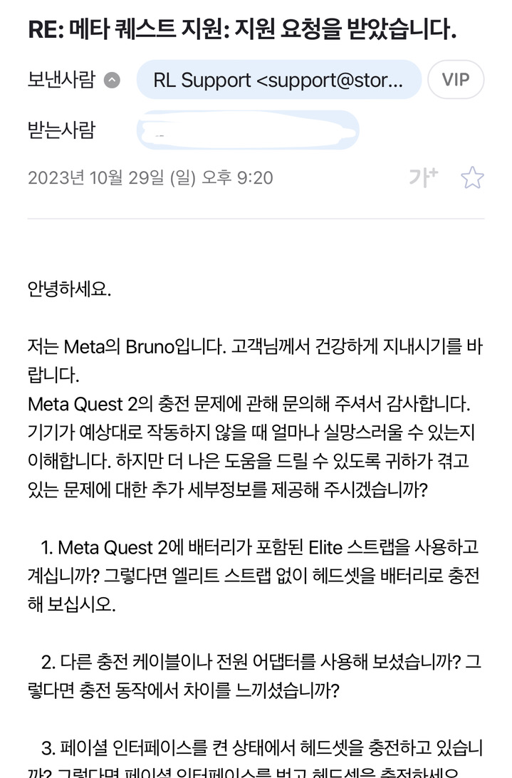 다음 이메일에서 알겠다고 하면서, 몇 가지 정보를 보내 달라고 합니다. 이름과 헤드셋 일련번호, 구매 영수증, 배송받을 주소, 개인통관부호 등등입니다.