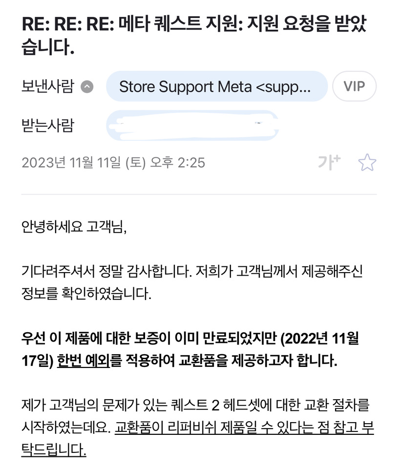 보증기간이 지나고 영수증도 없었지만, 퀘스트2를 새 제품으로 교환받을 수 있었습니다. 다만 시간이 다소 오래 걸렸는데요.