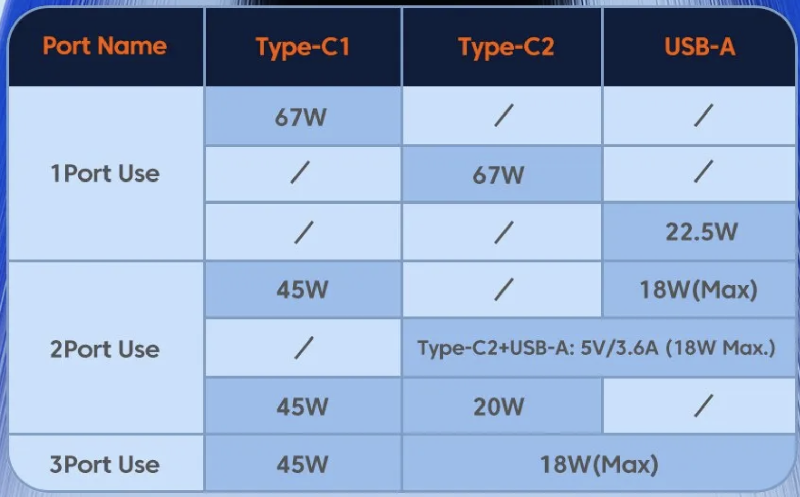 다만, 최근의 65W PD 충전기는 위 제품처럼 대부분 여러 개의 포트가 있고, 그 중 하나만 사용해야만 65W 속도로 충전됩니다. 다른 포트를 사용하면 충전 속도가 저하되며 터보 모드를 사용할 수 없게 되죠. 하지만 포트가 여러 개라는 것은 스마트폰, 스마트워치와 같은 다른 기기도 동시에 함께 충전할 수 있다는 뜻이기도 하므로 여행 등 편의성 면에서는 장점입니다.