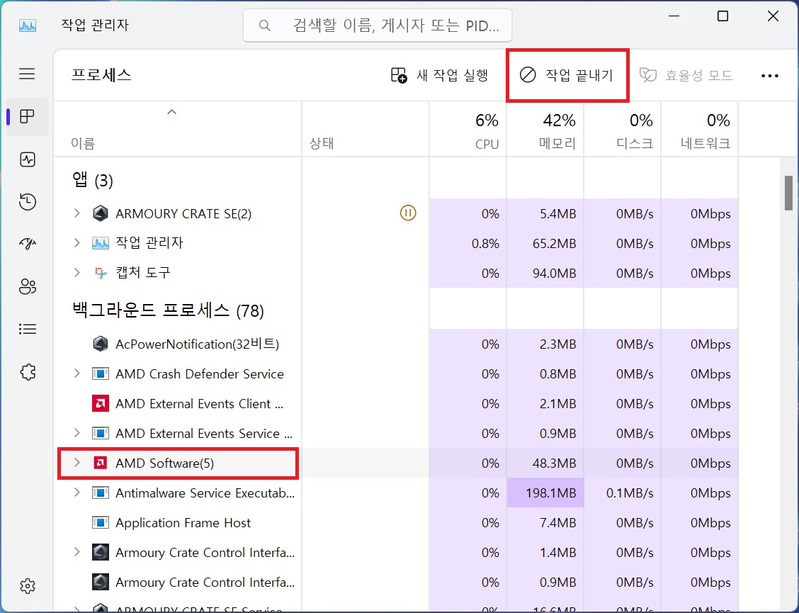 1. 작업관리자에서 AMD Software를 찾아서 선택한 뒤, 작업 종료를 누릅니다.