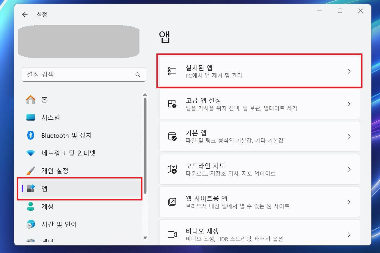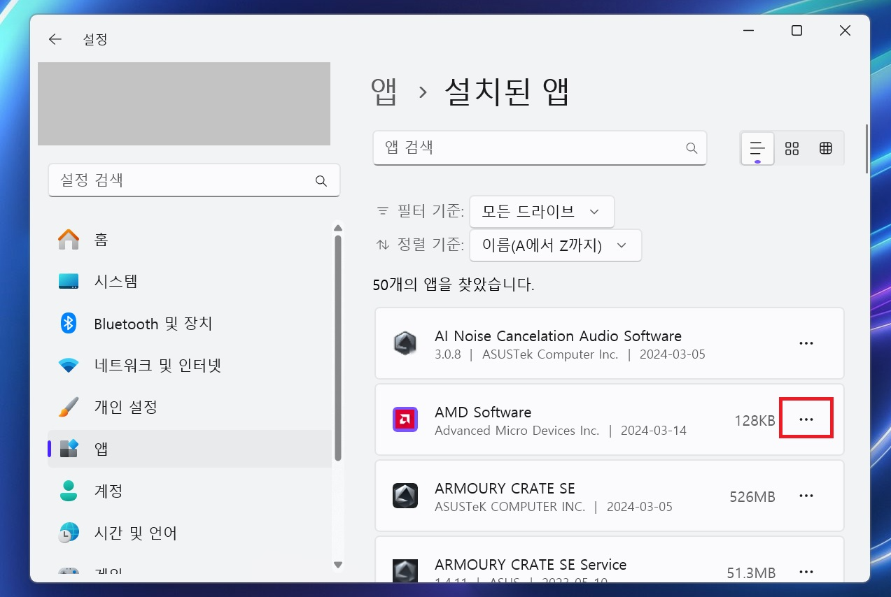 2. 윈도우 설정 앱을 켠 뒤, 앱 - 설치된 앱 으로 들어가서 AMD Software 옆에 ...을 클릭해 고급 옵션을 선택합니다.