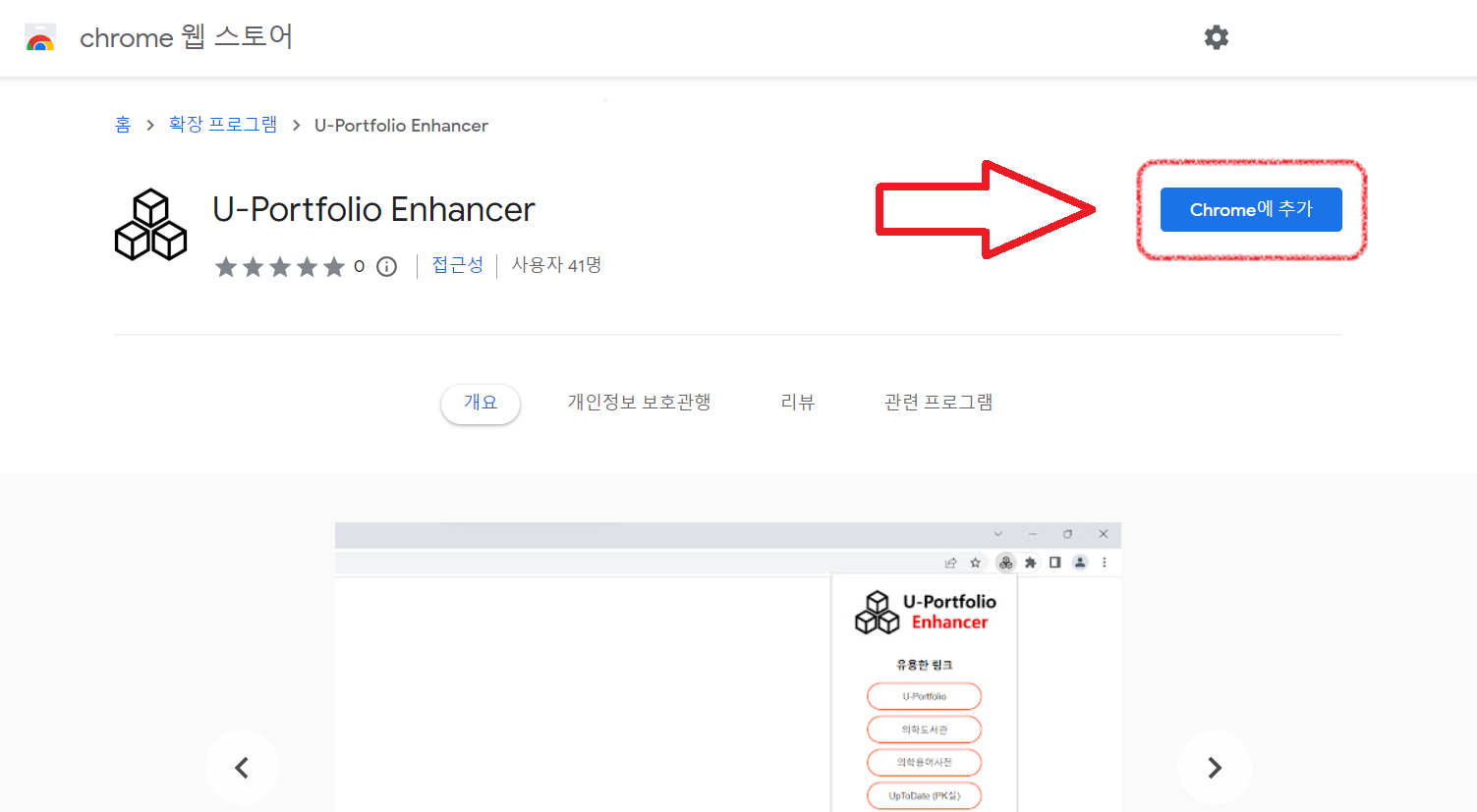 아래 사진과 설명을 따라해 주세요. 인터넷 창 오른쪽 위에 있는 퍼즐 모양 아이콘을 클릭하고, 'U-Portfolio Enhancer' 옆에 있는 핀 또는 눈 모양을 클릭해 주세요. (사람마다 다릅니다.) 화살표처럼 U