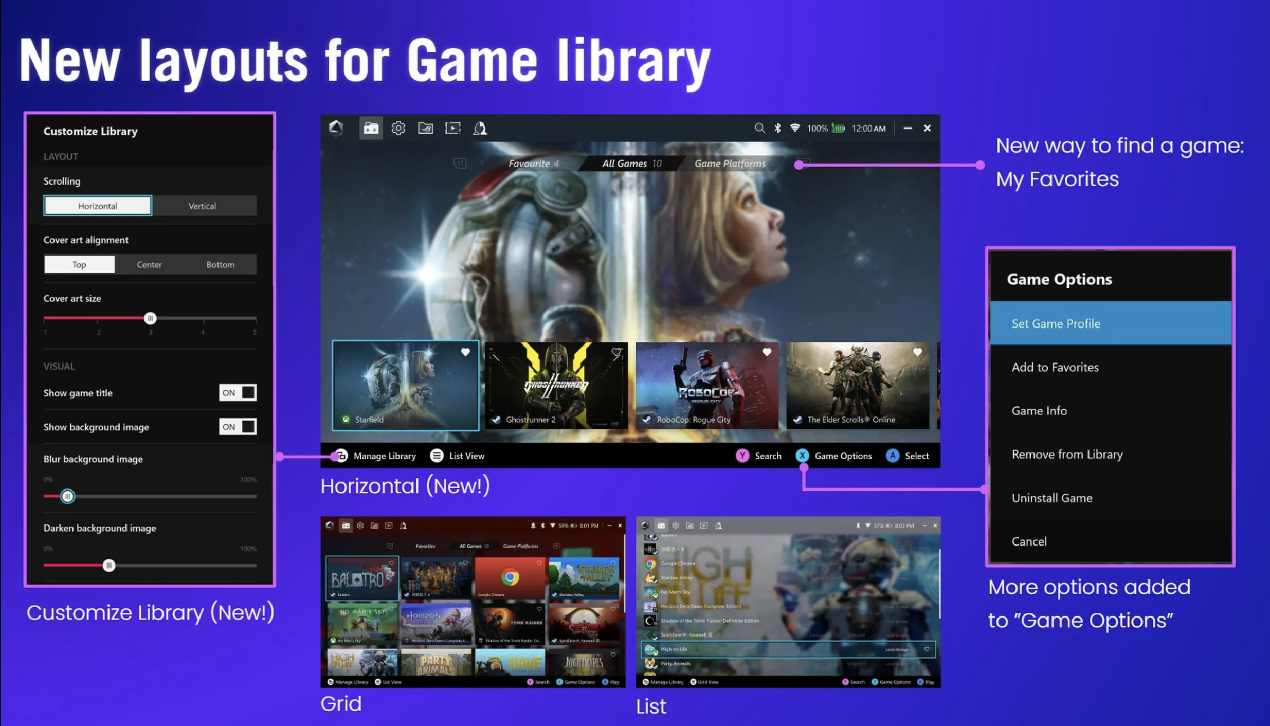 기존에는 격자나 목록 형태로 게임을 보여 주었는데, 새로운 나열 방식인 Horizontal view(수평)이 추가됩니다. 플레이스테이션의 홈 화면을 연상시키는 방식으로, 게임 썸네일이 수평으로 나열되어 있고 배경으로 포스터 이미지가 크게 보이는 방식입니다. 수평 화면에는 다양한 옵션이 있어 수직으로 스크롤하게 하거나, 배경 이미지에 블러 처리를 넣고 게임 이름을 숨길 수 있는 등 다양하게 커스터마이징이 가능합니다. 기존의 격자나 목록 방식도 새로운 UX에 맞게 깔끔하고 정갈하게 바뀔 예정입니다.