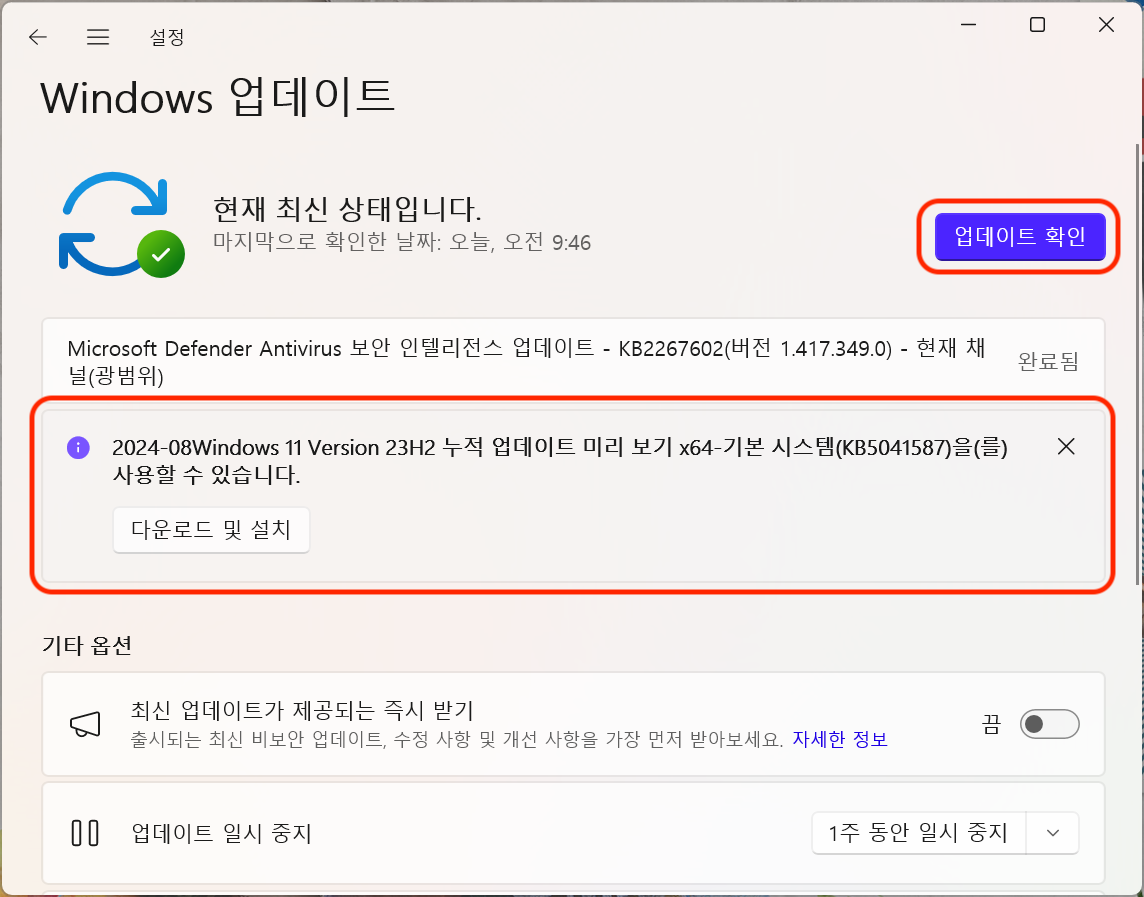 24H2 출시까지 기다릴 필요 없이 바로 윈도우 업데이트로 들어가 새로운 업데이트를 설치하면 됩니다.