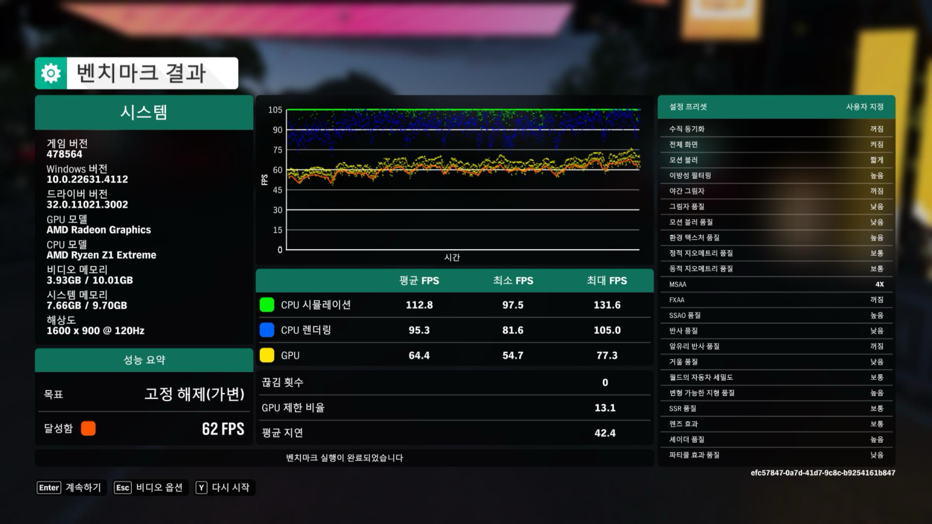 다음은 마블 스파이더맨 리마스터입니다. 별도의 벤치마크 모드가 없어 직접 플레이하며 프레임을 보았습니다.