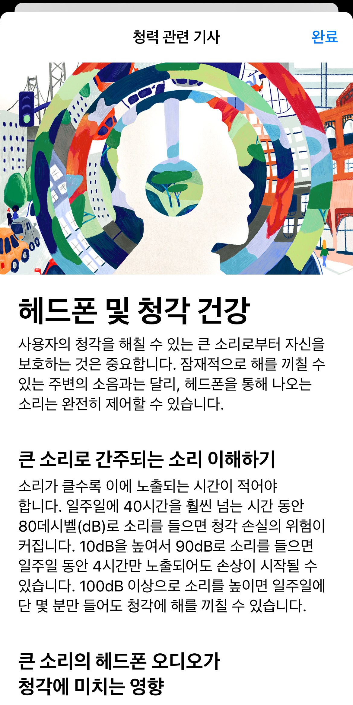 또한 검사 결과 아래에 애플이 제공하는 검사에 대한 설명과, 검사를 통해 확인할 수 있는 질환에 대한 설명이 상세히 써져 있었습니다. 설명은 기사(아티클)의 형태로 별도의 카드를 통해 제공되는데요. 이를 보면서 내가 어느 정도 수준의 청력 저하인 것인지, 앞으로 어떻게 해야 하는지에 대해 자연스럽게 교육받을 수 있었습니다. 또한 이는 애플 생태계 내에서 도움을 받을 수 있는 방법을 자연스럽게 소개하고 안내해주는 역할도 하였습니다.