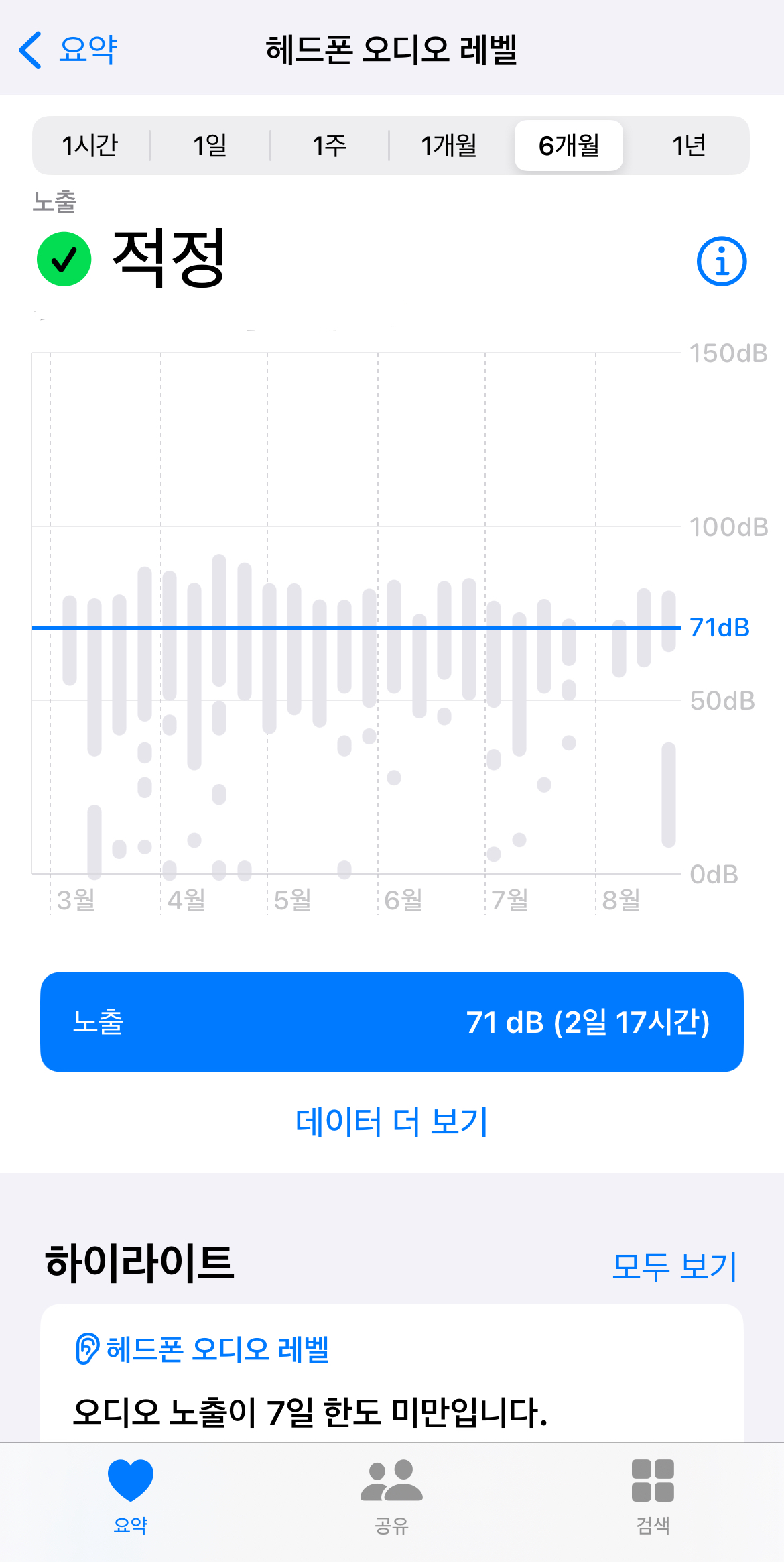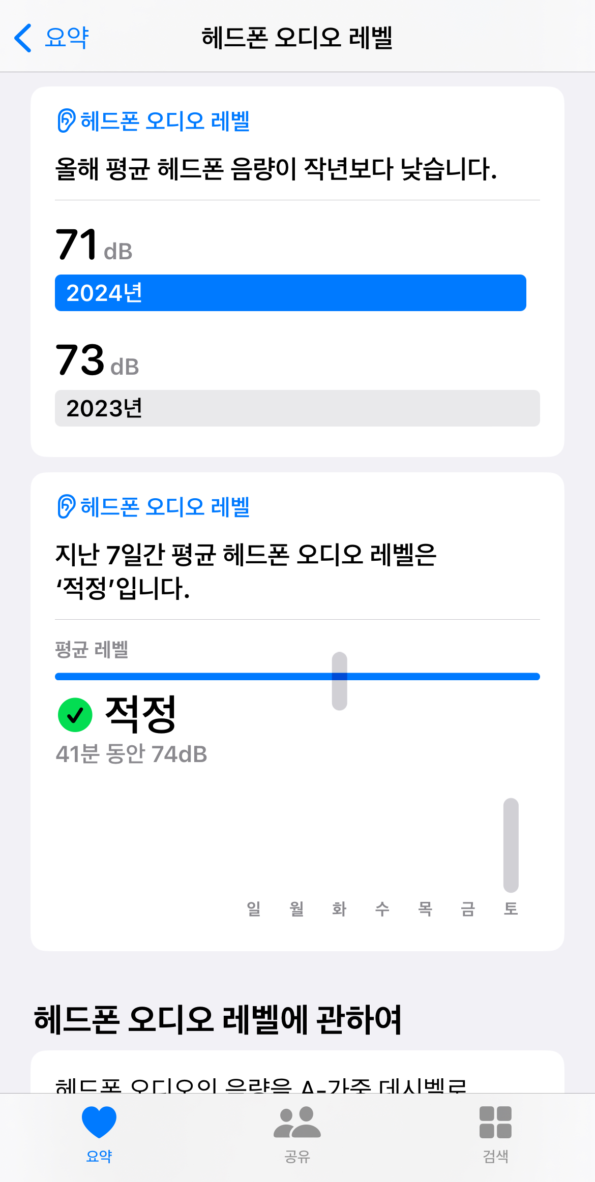 또한 청각장애 환자의 블로그 글을 보면서, 젊은 청각장애 환자에서 추가적인 청력 손실의 흔한 원인으로 '높은 이어폰/헤드폰 볼륨'이 있다는 것을 알았습니다. 관련 기능을 '건강' 앱에서 본 것 같아 찾아보니, '헤드폰 오디오 레벨'이라는 이름으로 내가 지금까지 아이폰에 연결된 이어폰으로 들은 소리의 음량을 기록해둔 자료가 정리되어 있는 것을 확인할 수 있었습니다.