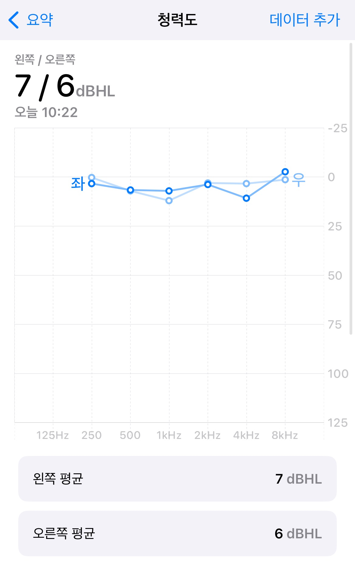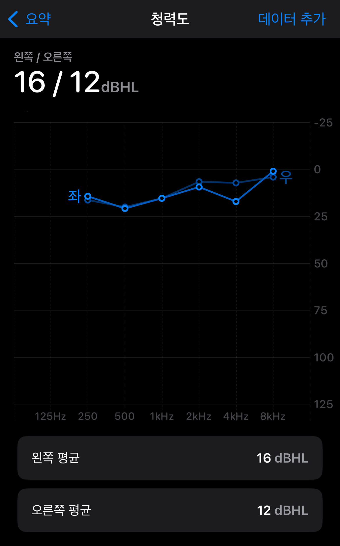 집으로 돌아와 한참 동안 질환에 대해 알아보다가, Mimi Hearing Test에서 아이폰의 '건강'앱으로 청력 민감도 검사 결과를 Export 할 수 있다는 것을 알게 되었습니다. 건강 앱으로 검사 결과를 옮기고 살펴 보니 애플의 양식에 알맞게 데이터가 잘 정리되어 옮겨진 것을 확인할 수 있습니다.