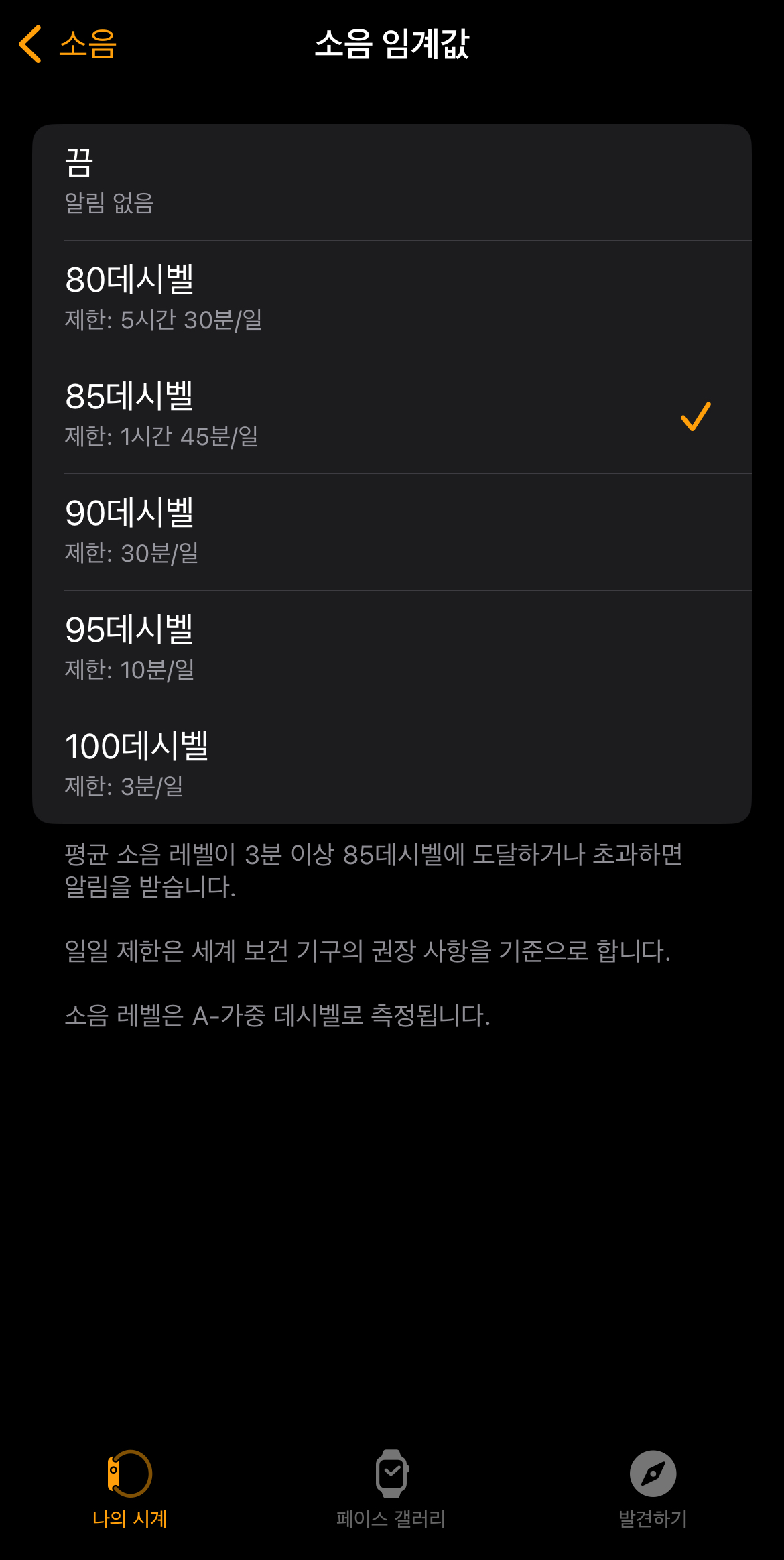 단순히 역치 설정만 나열되어 있는 것이 아니라 세계 보건 기구(WHO) 기준 각 역치가 하루에 몇 분까지 허용되는지, 언제 알림이 오는지까지 설명되어 있어 판단에 도움을 받을 수 있었습니다.