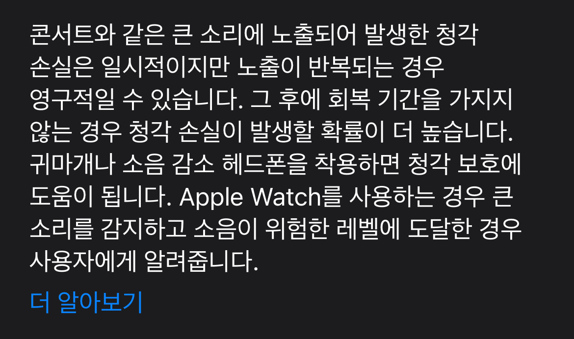즉, 손상이 생긴 후에 지속적으로 소음에 노출되면 손상이 영구적이 되거나 악화될 수 있으며, 이를 방지하기 위해 애플워치에는 소음 레벨을 확인할 수 있는 기능이 있다는 것이었습니다.