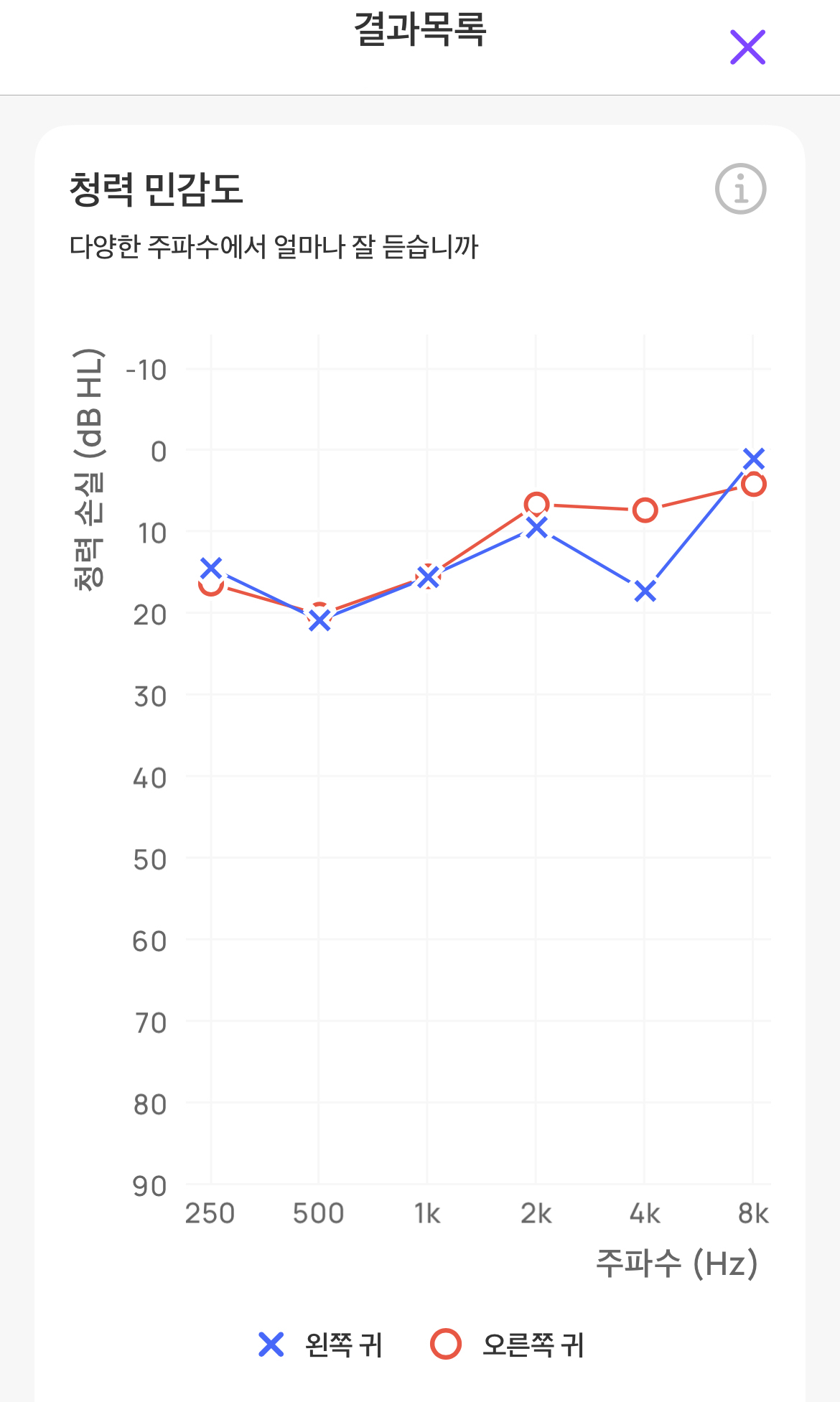 앱에서 지시하는 데로 청력 검사를 완료하면 청력도(Audiogram)와 매우 유사한 청력 민감도 그래프와 전반적인 청력 상태를 나타내는 지표 몇 가지를 보여줍니다. 법적인 문제 때문에 청력도라 표기하지 못할 뿐 사실상 동일한 그래프라고 보시면 됩니다. 양쪽 귀에 대해 각 주파수의 순음마다의 청력 역치를 보여주고 있습니다.