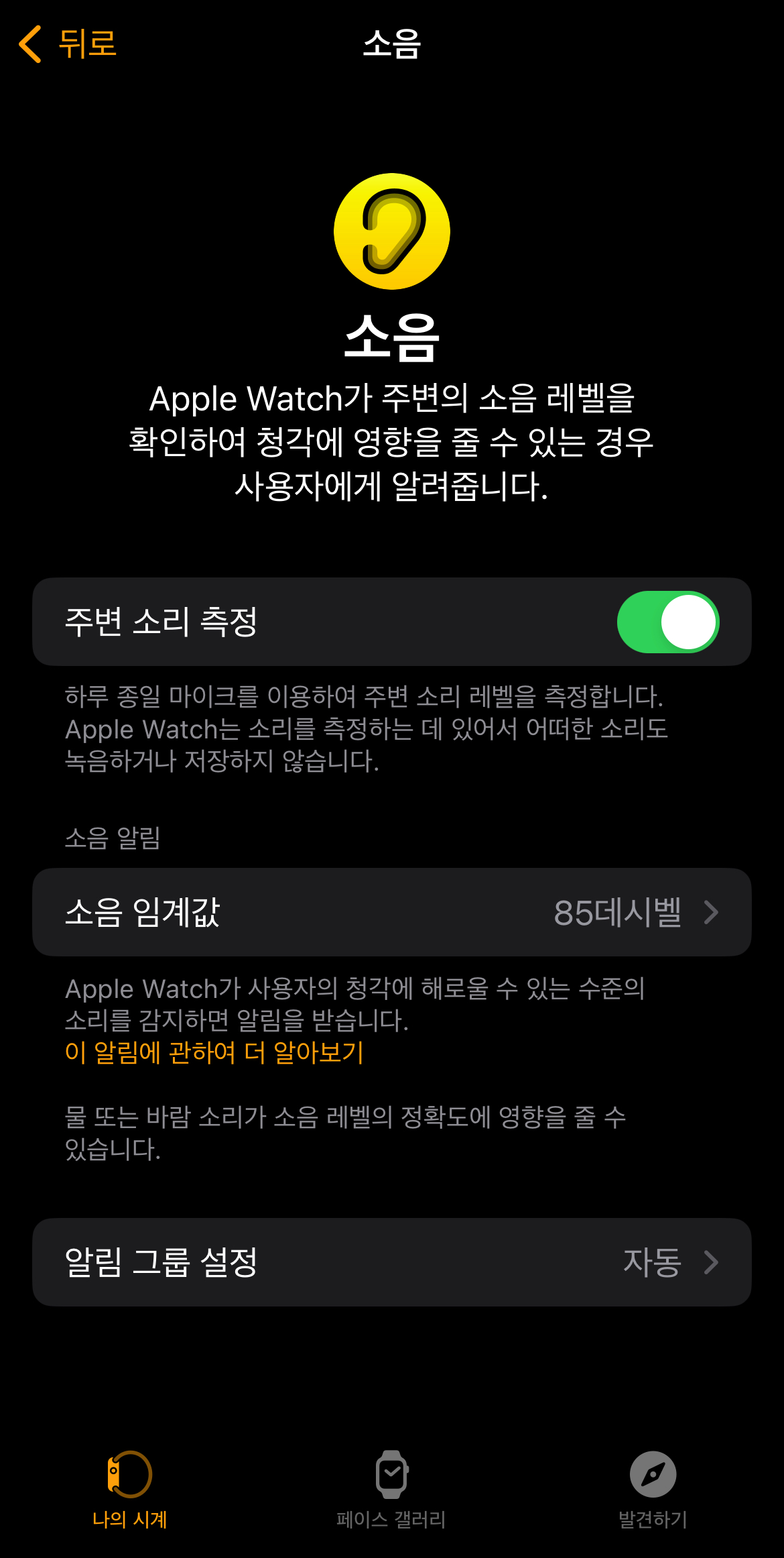 '워치' 앱이 열리면서 애플 워치의 주변 소음 측정 기능 설정창으로 바로 안내되었습니다.