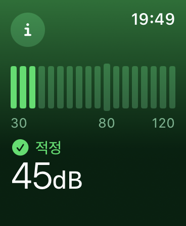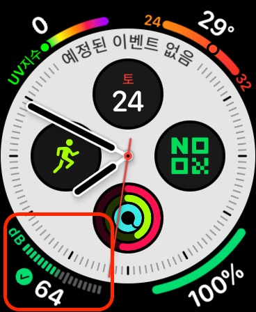 애플 워치 자체에서 '소음' 앱으로 실시간으로 주변 소음을 측정할 수 있었으며, 워치 페이스에서 컴플리케이션으로 현제 주변 소음 정도를 편하게 확인할 수 있었습니다.