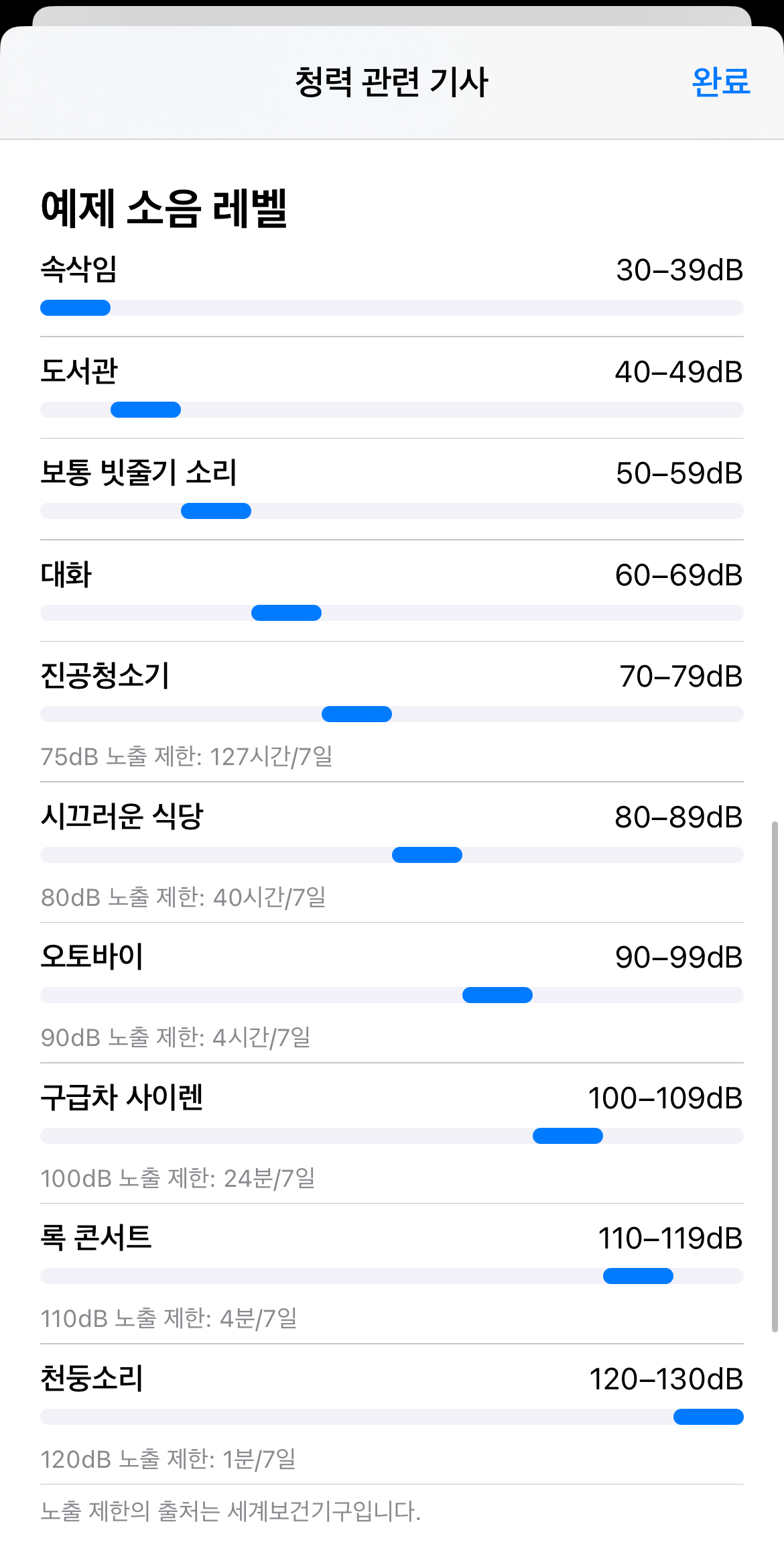 청력도와 마찬가지로 결과 아래에 자세한 설명이 있는 글이 있었습니다. 이 글을 통해서 지금 내가 이어폰으로 듣고 있는 소리의 음량 수준이 어느 정도인지, 어느 정도 이상이 되면 위험한지를 빠르게 알 수 있었습니다.