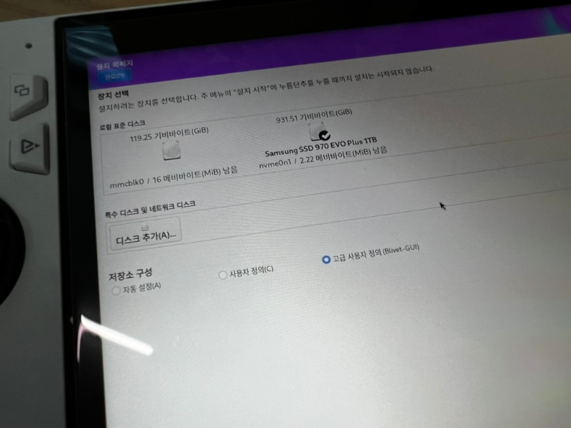 맨 아래 '저장소 구성'에서 '고급 사용자 정의(Blivet-GUI)'를 선택하고 왼쪽 위 완료 버튼을 누릅니다.