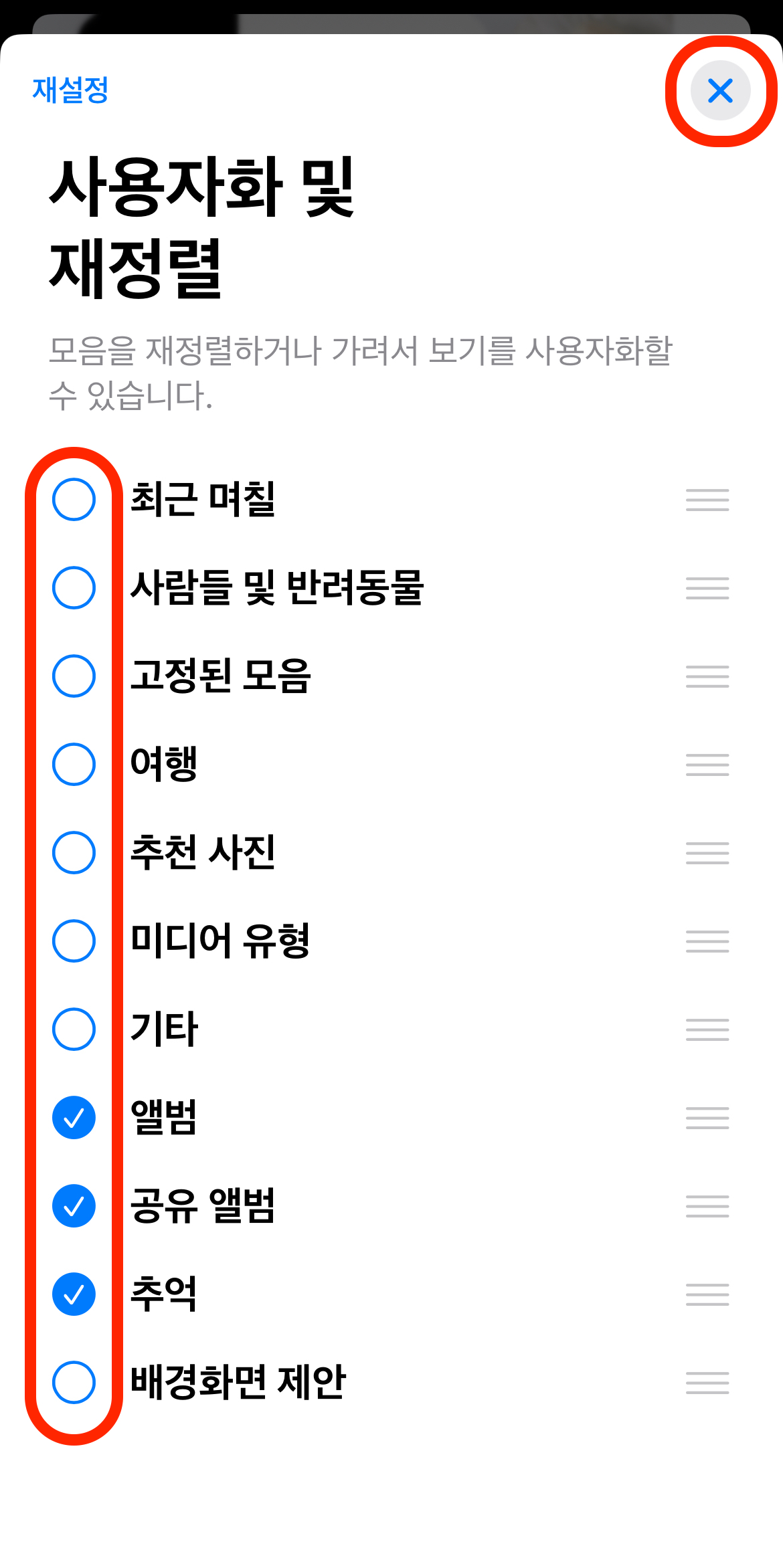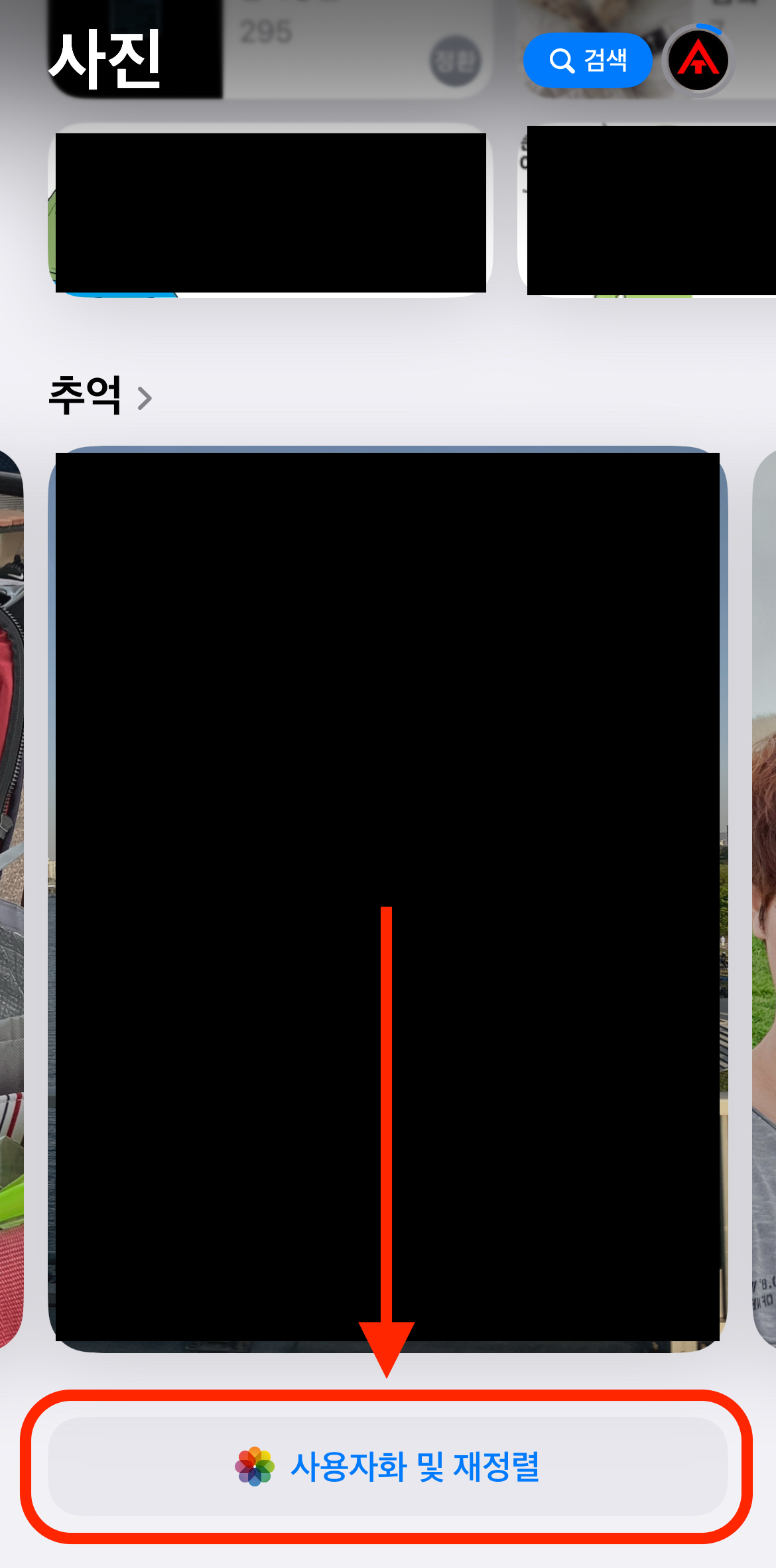 1. 사진 앱에서 가장 아래로 쭈욱 스크롤해서, 맨 아래 있는 사용자화 및 재정렬 버튼을 누릅니다.