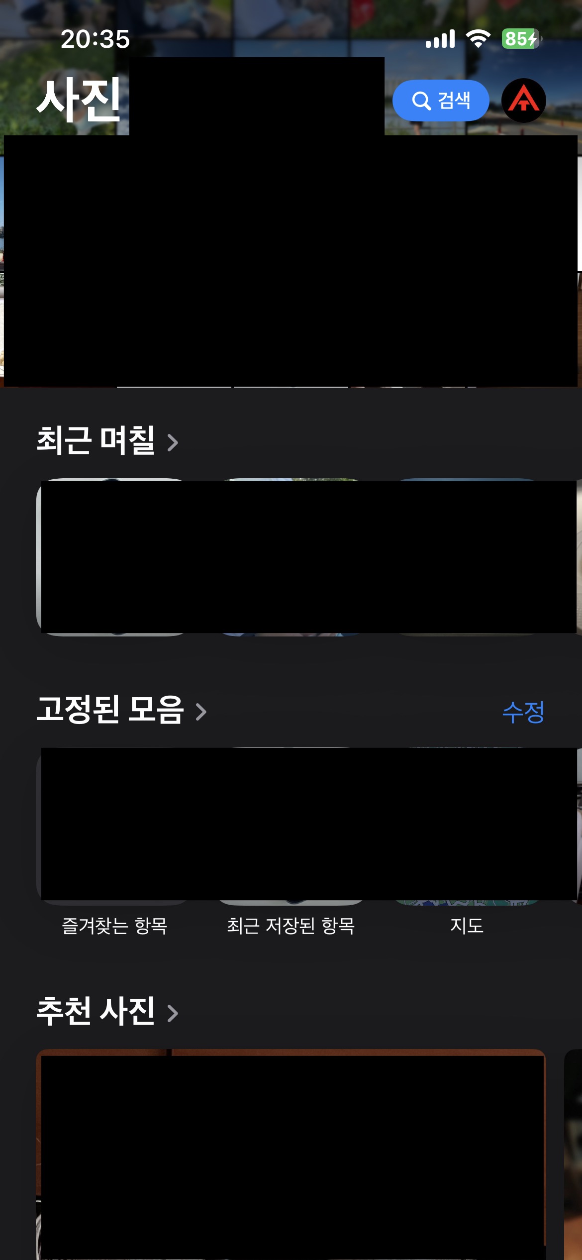 사진 목록 아래에 생긴 다양한 항목들은 사실 이전에도 있었던, 유용한 기능들입니다. 저의 경우 공유 앨범이나 미디어 유형은 자주 사용하는 유용한 항목입니다.