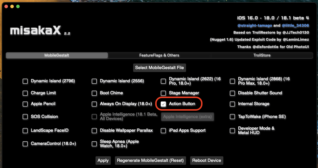 com.apple.MobileGestalt.plist라는 아이폰 내부 설정 파일을 수정해 카메라 무음, 배터리 충전 제한, 다이나믹 아일랜드 등 다른 국가나 최신 아이폰에만 있는 기능을 활성화시킵니다. 애플이 숨겨둔 내부 설정을 켜는 것이므로, 탈옥과 달리 수리가 필요할 때에는 데이터 초기화 없이도 원상복구가 가능하며, 보안이나 보증(A/S) 관련해서 문제가 생길 부분 또한 적습니다(추측).