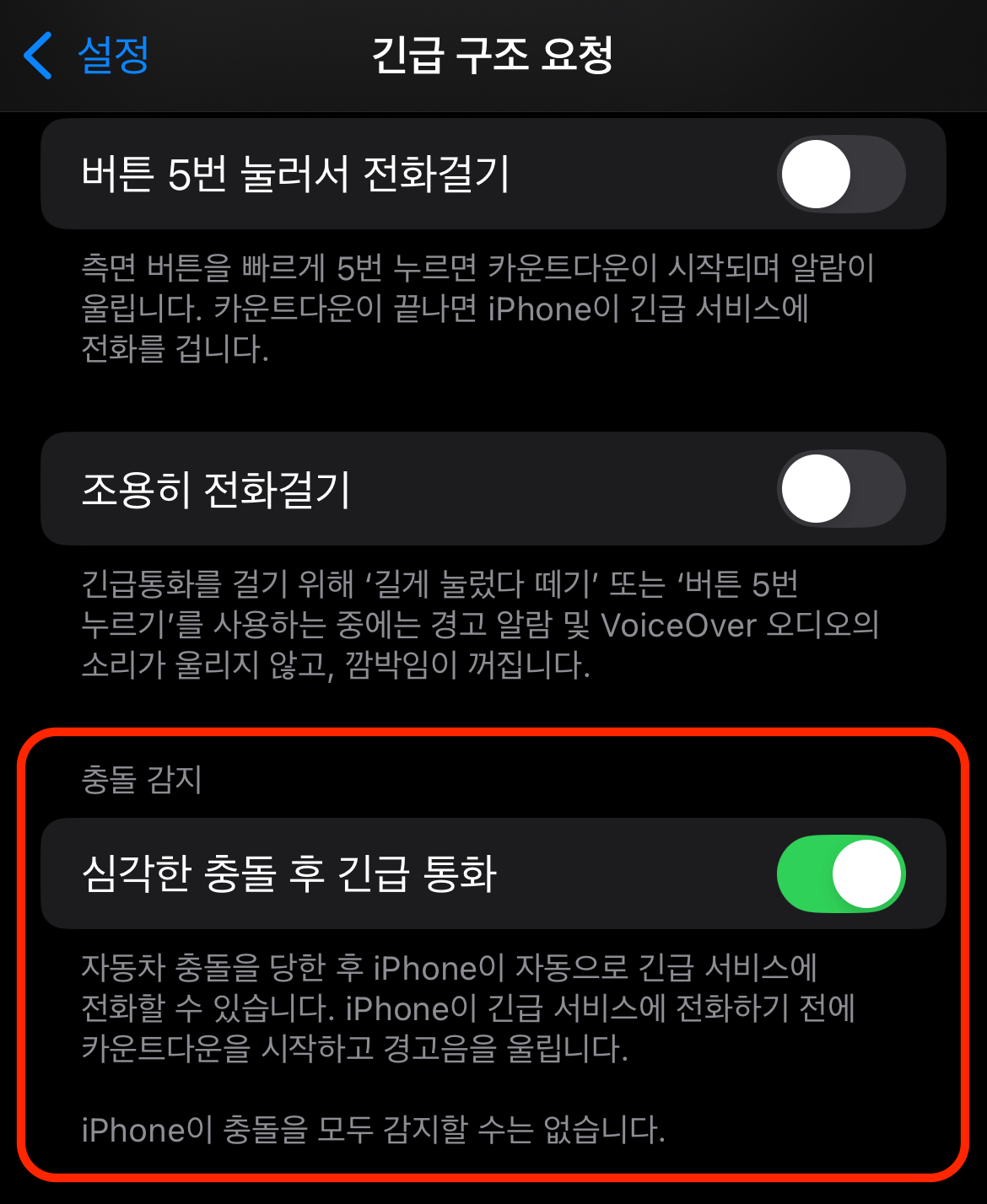 트윅이 잘 적용되었다면, 설정에서 '긴급 구조 요청' 메뉴 안에 '심각한 충돌 후 긴급 통화' 항목이 새로 생겨 있습니다. 오류가 나는 부분 없이 잘 활성화되어 있고, 설명도 아이폰 14 시리즈의 그것과 같습니다.