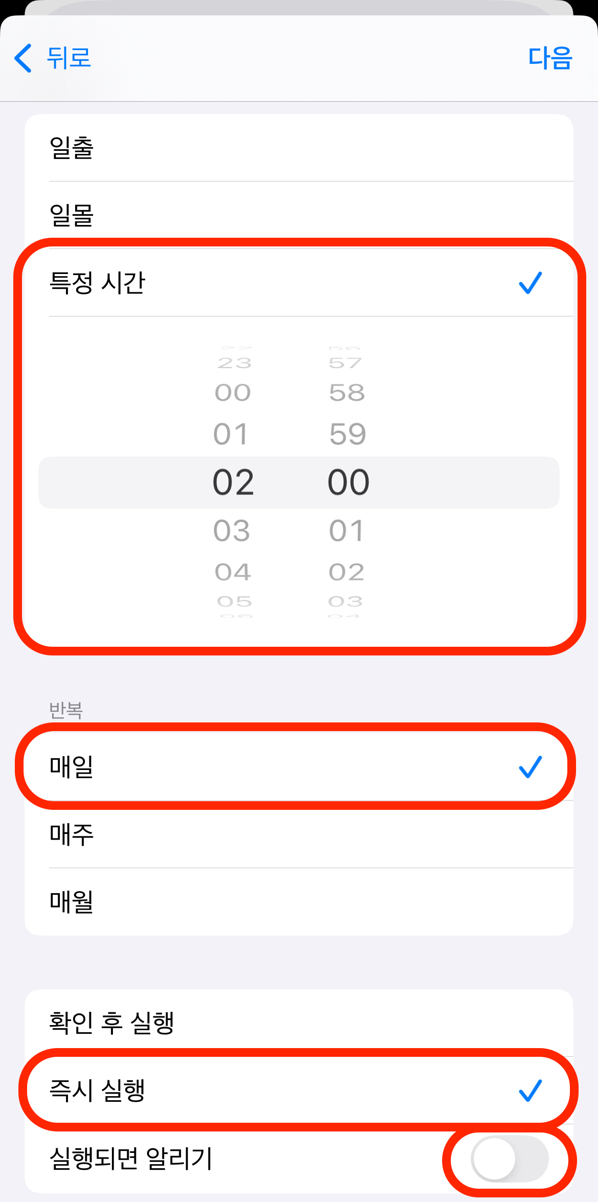'특정 시간'을 선택하고, 오른쪽 사진처럼 설정해 줍니다.