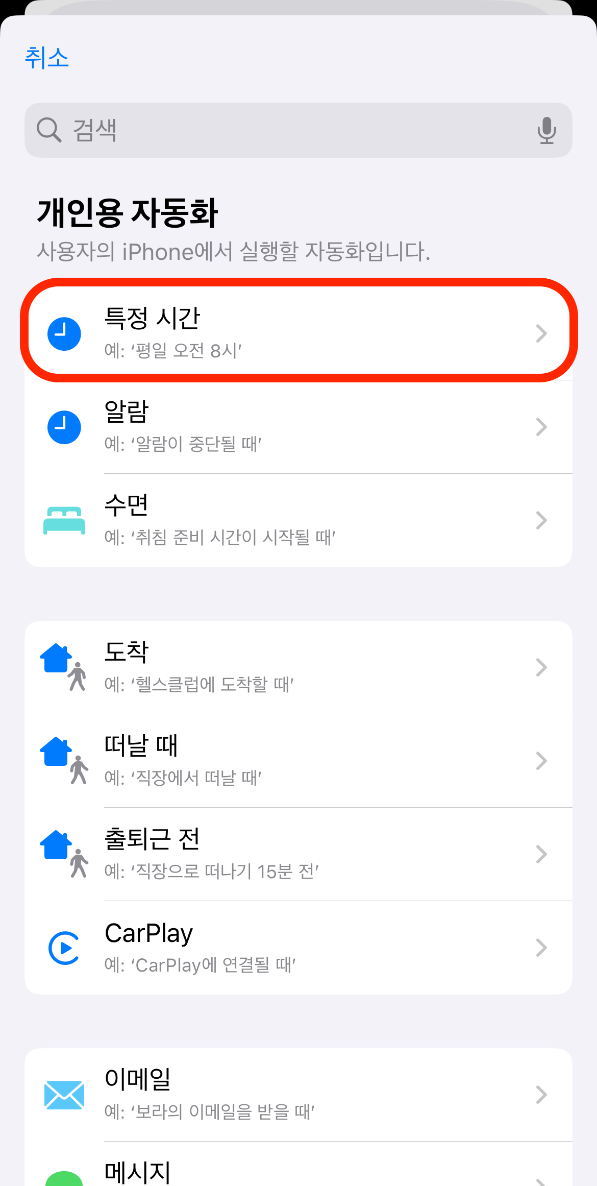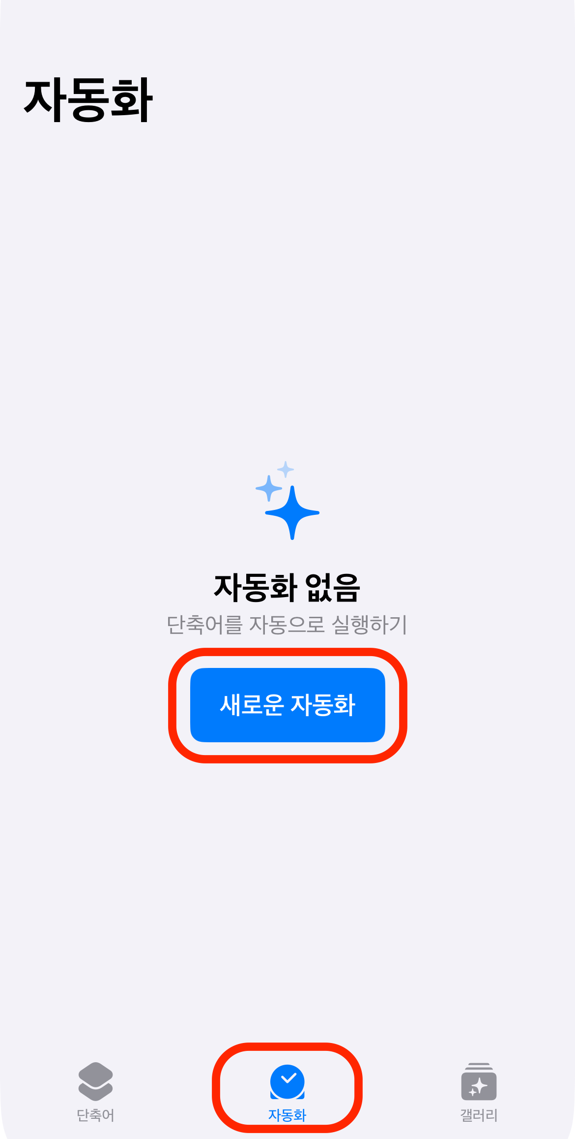 단축어 앱의 아래 탭에서 자동화 로 들어가 새로운 자동화 버튼을 누릅니다.