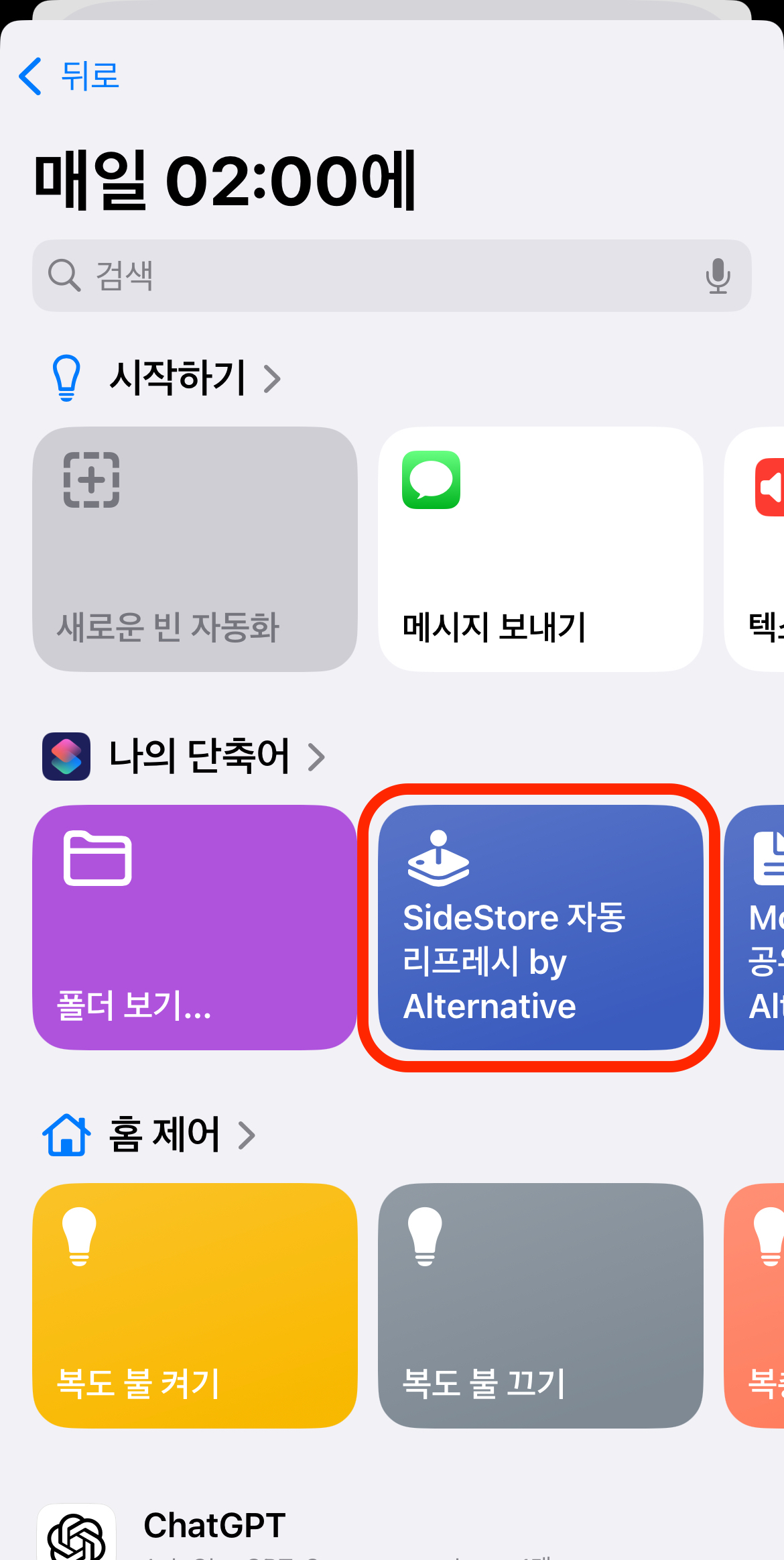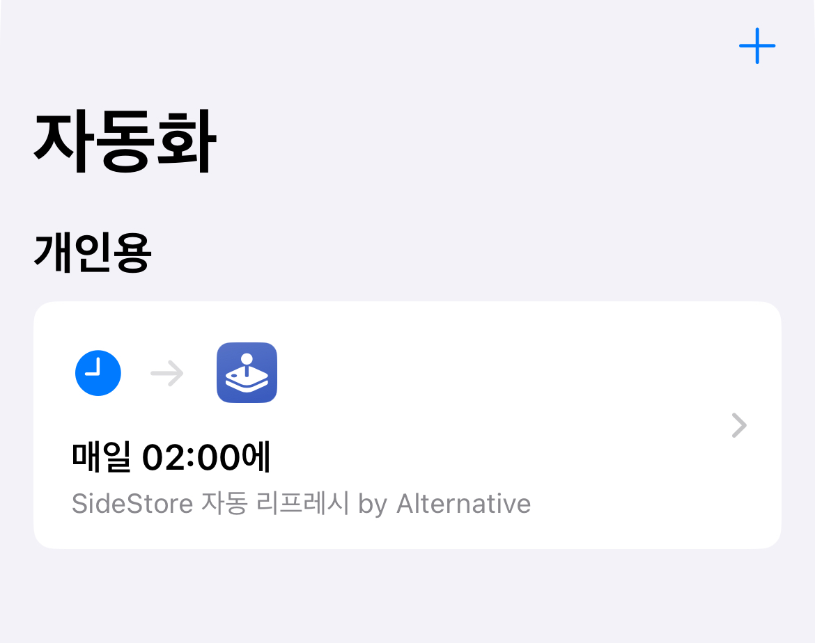 이 단축어를 실행하는 게 매번 StosVPN과 SideStore를 켜서 리프레시하는 것보단 편하겠죠? 여기서 자동화 세팅까지 해주면 단축어를 눌러줄 필요도 없습니다.