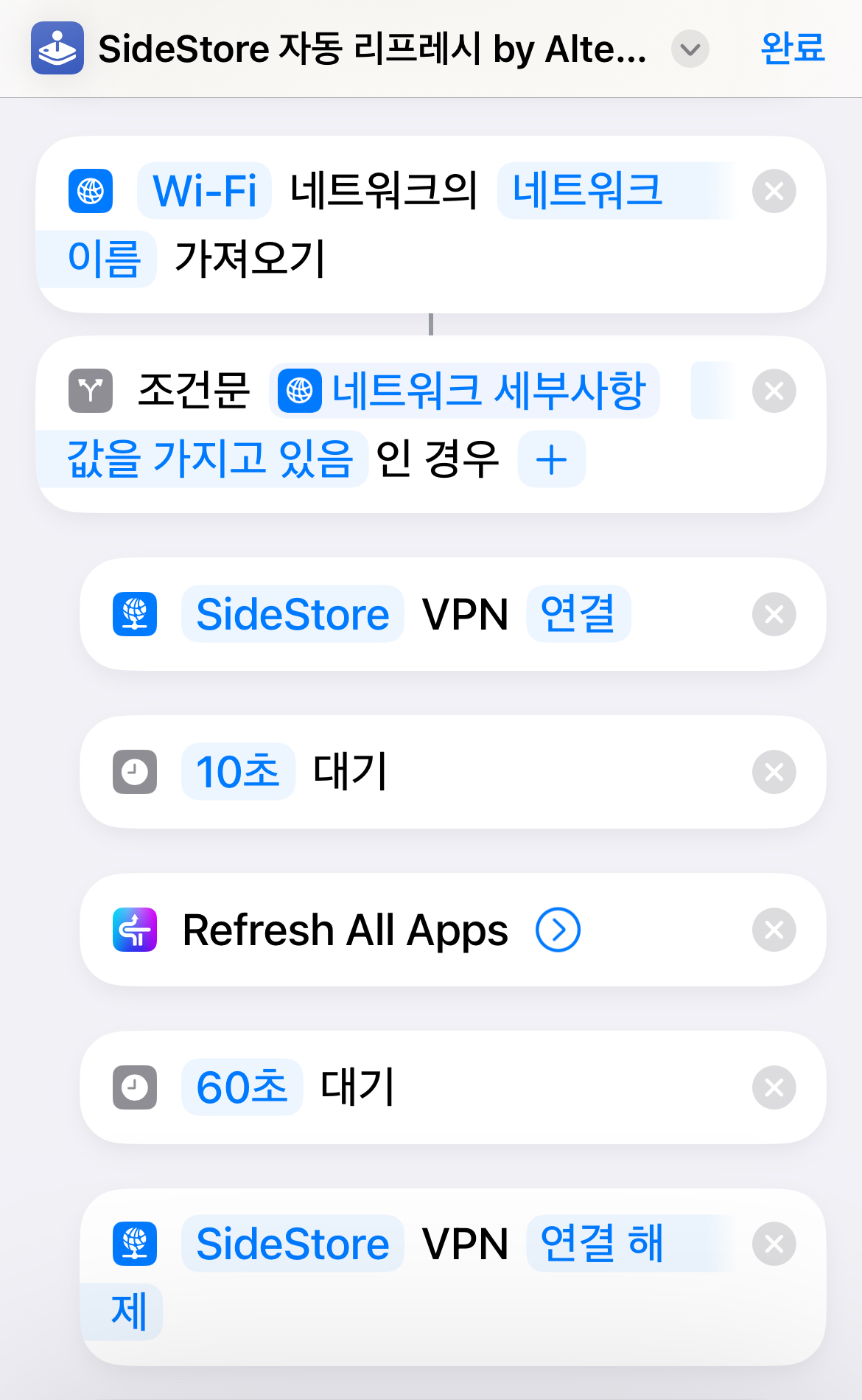 이 단축어는 아래 사진과 같이 짜여져 있습니다. 단축어를 실행시키면 와이파이에 연결되어 있는지 확인한 후, 와이파이 상태라면 StosVPN을 켭니다. 10초의 딜레이를 준 뒤 SideStore 전체 앱 리프레시를 시행하고, 60초 동안 리프레시할 시간을 준 후에 StosVPN을 다시 꺼줍니다.