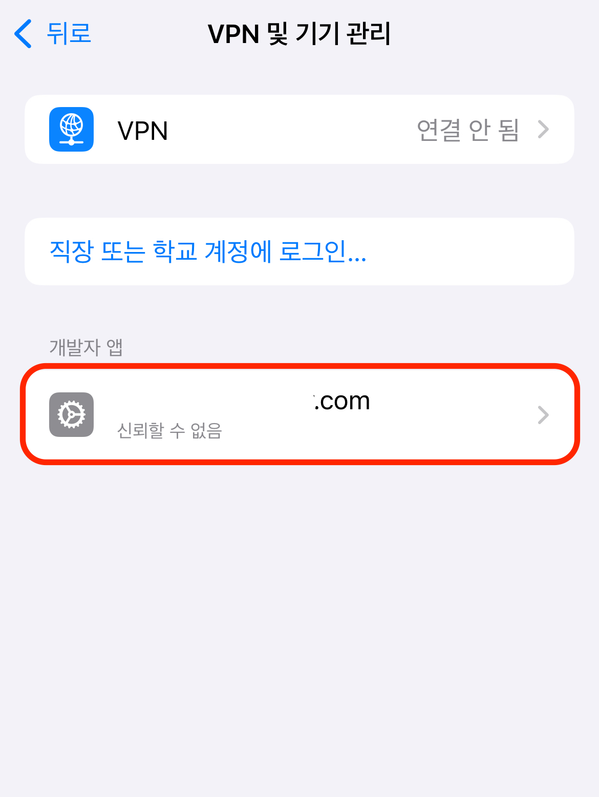 하지만 앱을 눌러도 '신뢰하지 않는 개발자'라는 문구가 나오면서 실행이 되지 않습니다. 우선 설정 앱을 켜고 일반 - VPN 및 기기 관리 에 들어가 개발자 앱 밑에 있는 내 애플 아이디를 눌러야 합니다.