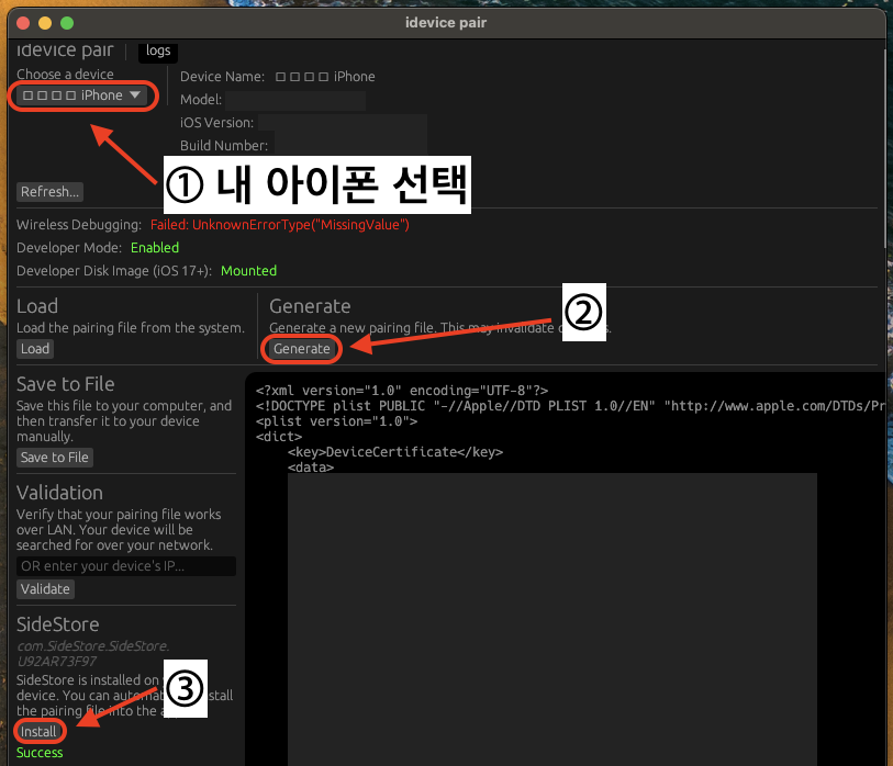 처음에 다운받은 idevice pair라는 프로그램이 컴퓨터와 아이폰, 사이드스토어를 서로 페어링해주는 역할을 합니다.
