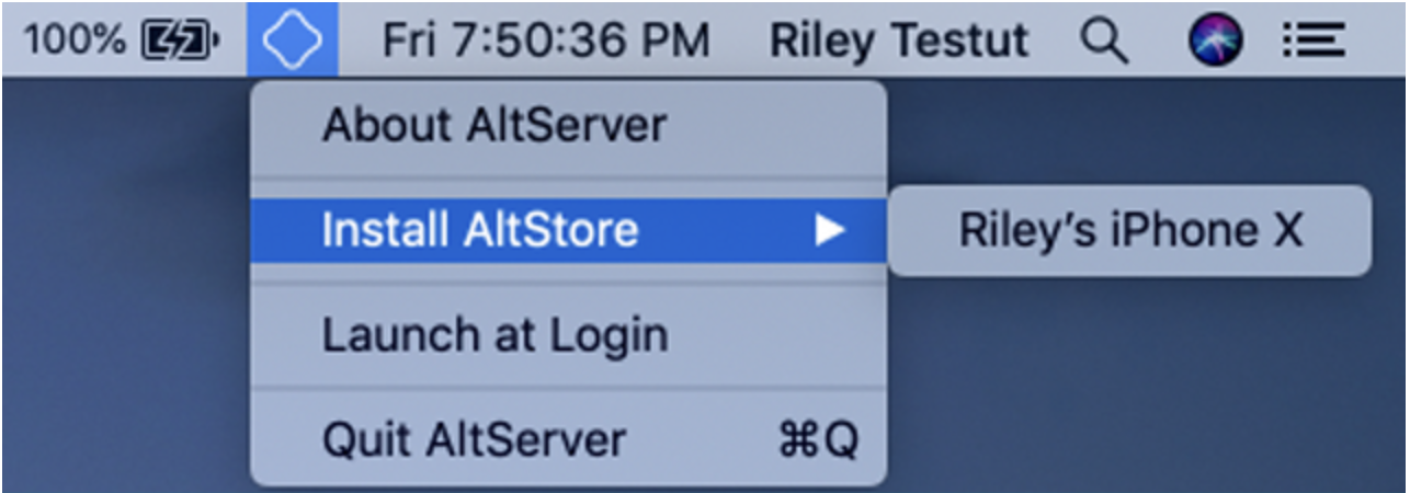 (위 사진에는 Install AltStore라는 메뉴로 들어갔으나, Shift/Option 키를 누르고 클릭했다면 저 자리에 Sideload .ipa 메뉴가 있어야 합니다. 확인하시고 클릭하세요!)