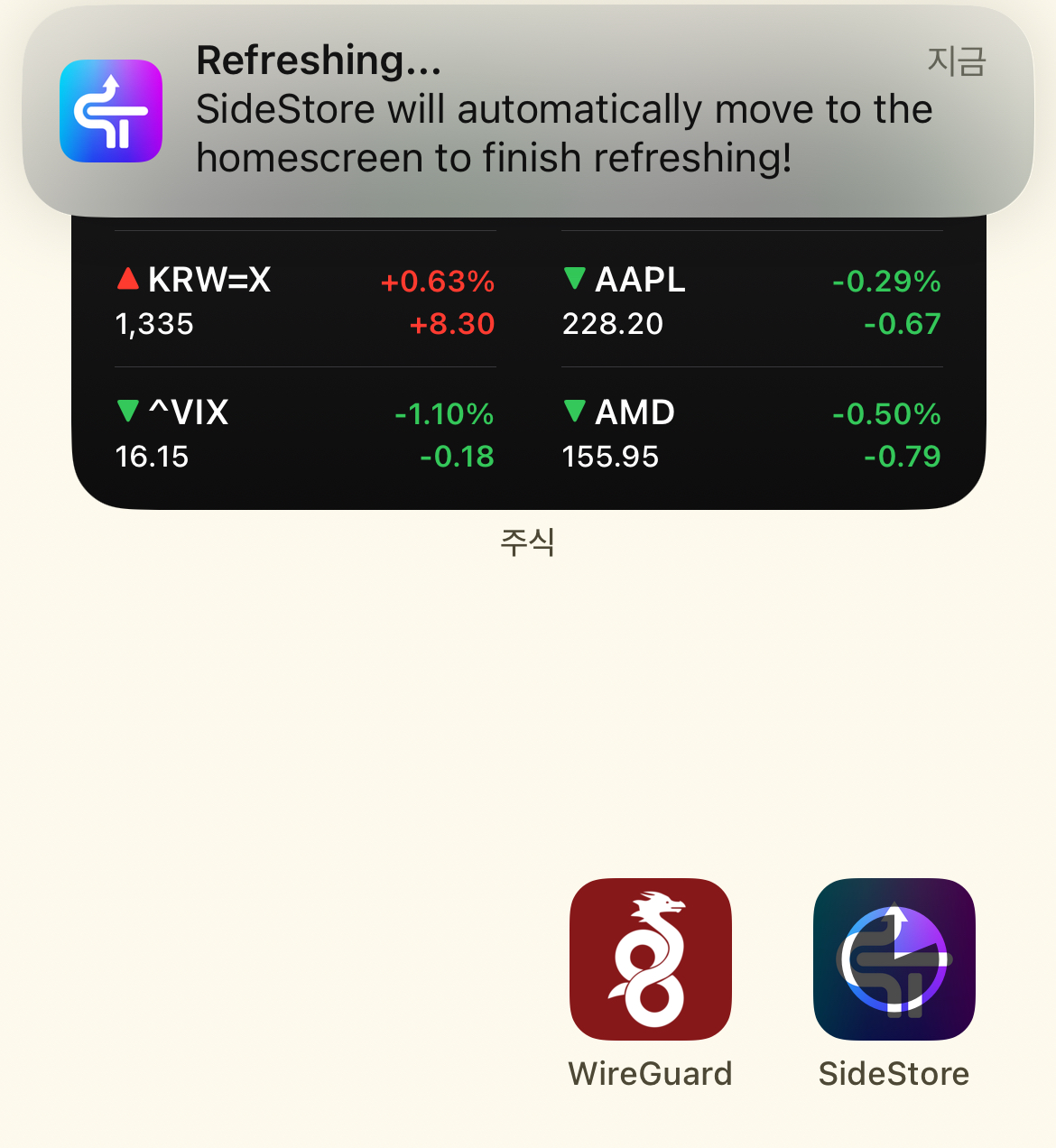 로딩이 되다가 홈 화면으로 나가지고, 아래처럼 알림이 오고 SideStore 앱 설치 로딩창이 잠시 뜨다가 설치가 완료되면 설정이 제대로 되었다는 뜻입니다!