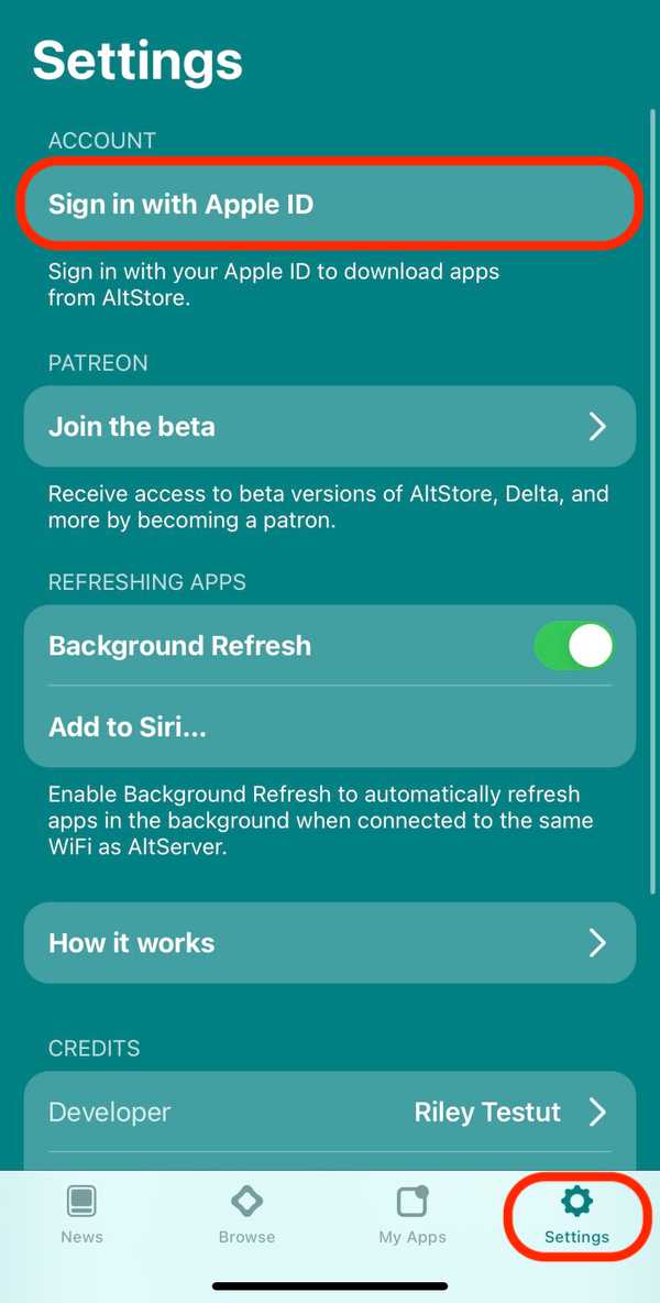 알트스토어 앱을 켜고, Settings 탭으로 들어가 Sign in with Apple ID를 눌러 애플 아이디로 로그인해주세요.