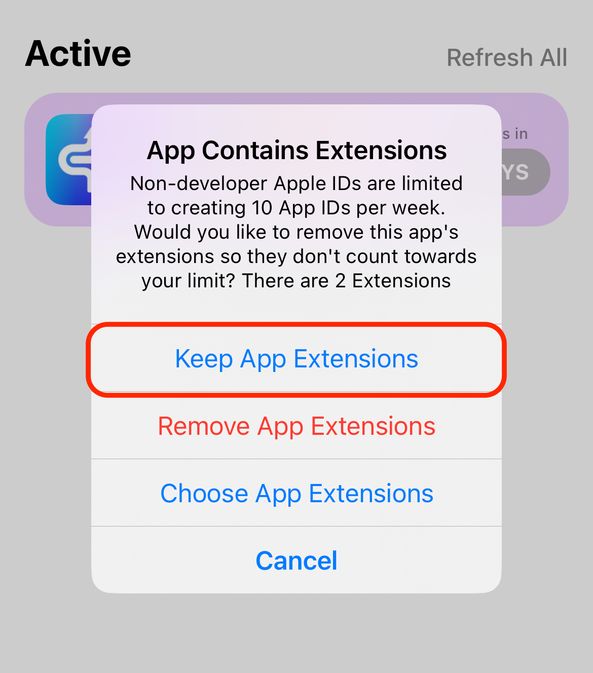 설치 중에 아래와 같은 팝업창이 뜬다면 맨 위의 Keep App Extensions 를 선택하면 됩니다.