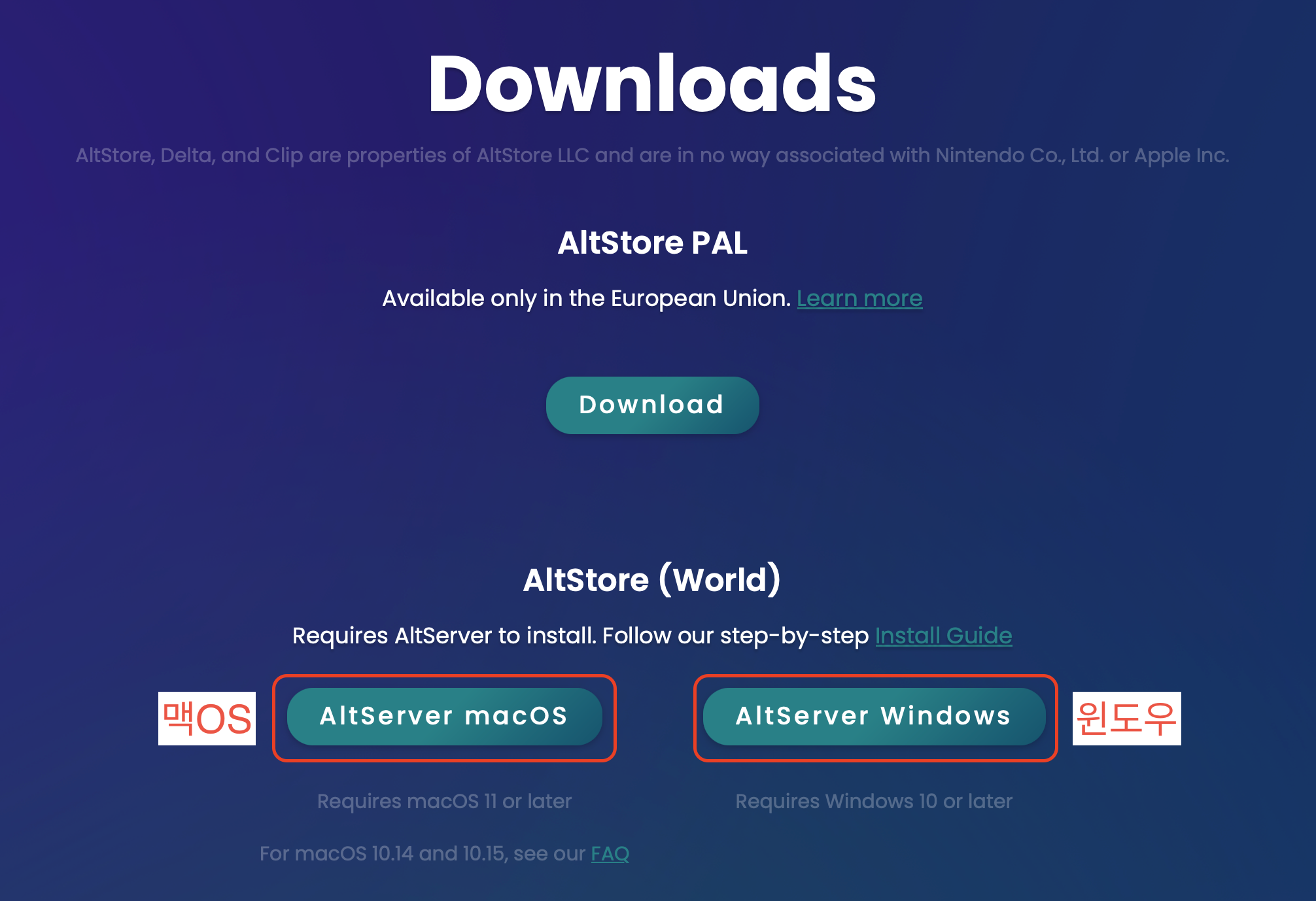 아래로 스크롤하면 Downloads 페이지가 나옵니다. 맥은 아래 왼쪽 버튼, 윈도우 컴퓨터는 아래 오른쪽 버튼을 눌러 AltServer라는 프로그램을 다운받습니다. AltServer는 개발자 도구 대신 알트스토어 인증을 해 주는 컴퓨터 프로그램으로, 아이폰에서 알트스토어를 사용하려면 주기적으로 AltServer를 통해 인증을 해 주어야 합니다.