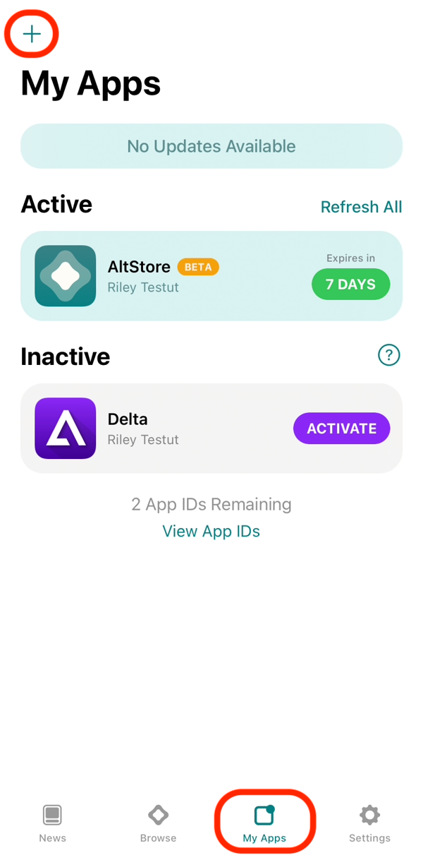 리프레시를 하려면 먼저 컴퓨터에서 AltServer를 실행하고 컴퓨터와 아이폰을 케이블로 연결한 채로 알트스토어 앱의 My Apps 탭에 들어가 Refresh All을 누르면 됩니다. 로딩이 끝나면 알트스토어와 알트스토어로 설치된 앱이 애플의 인증을 받아 모두 리프레시가 되며 7일 동안 사용할 수 있게 됩니다.
