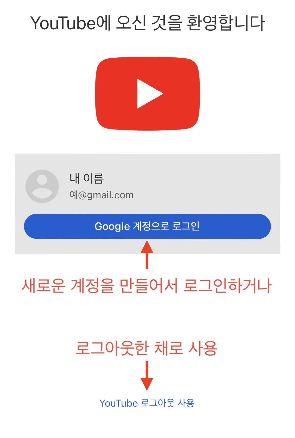 앱을 열고 구글 계정으로 로그인합니다. 이때 구글 계정은 원래 쓰던 계정을 사용해도 되지만, 구글의 정책에 따라 계정 정지를 당할 수도 있습니다. 따라서 새로운 구글 계정을 만들어 사용하시거나, 처음 화면에서 'YouTube 로그아웃 사용'을 눌러 로그인하지 않고 사용하시는 걸 추천드립니다.