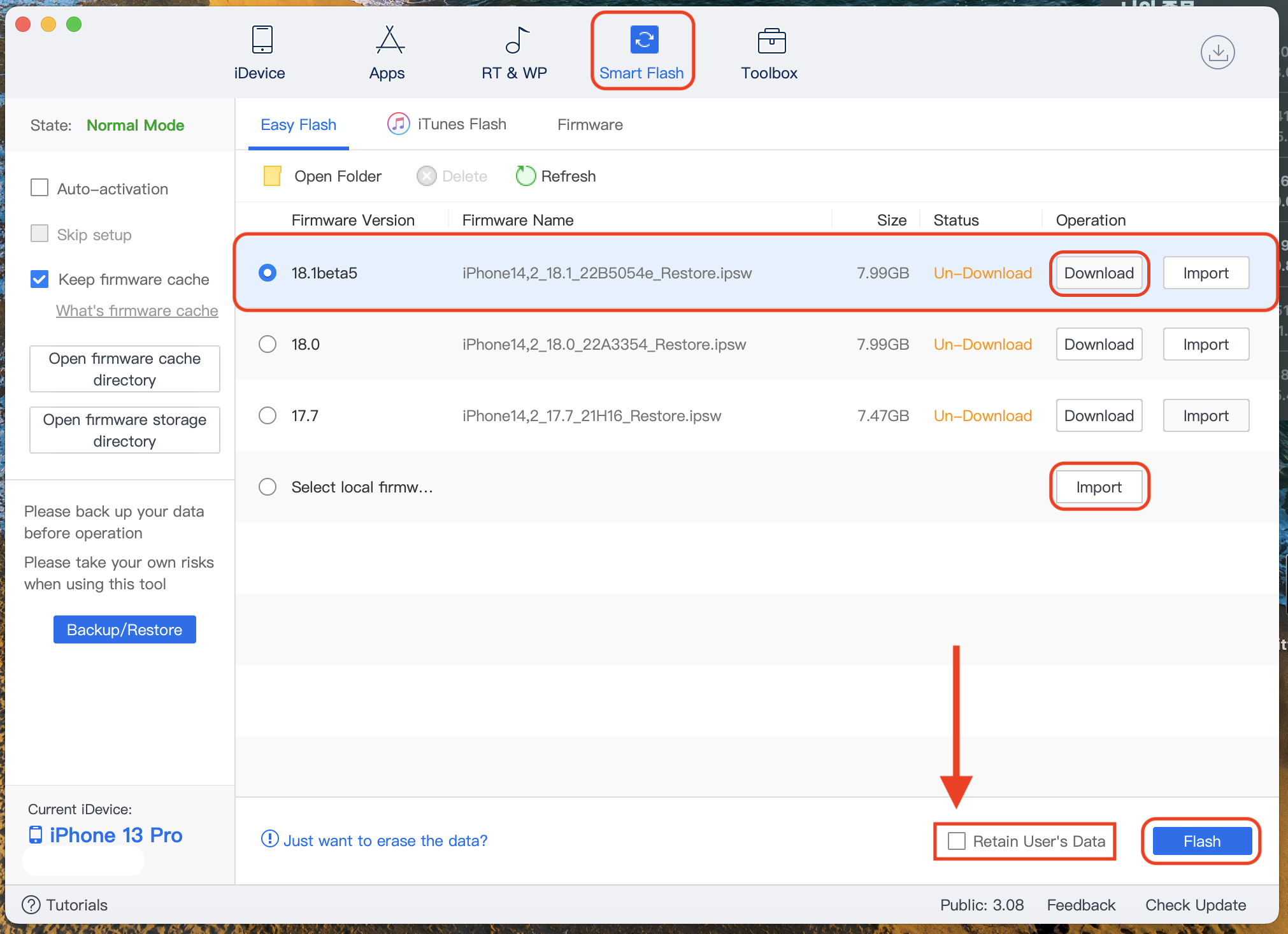 3uTools에서 Smart Flash를 선택하시고, 나오는 창에서 다운그레이드를 원하는 iOS 버전을 선택하고 옆에 있는 Download 버튼을 눌러 주세요. 이 목록에 나오는 버전이 보통 애플이 아직 Signing을 하고 있는 버전입니다. 다운로드가 다 되었으면 그 iOS 버전을 선택한 상태로 아래에 있는 'Retain User's Data' 체크박스를 선택하고 Flash를 누르면 됩니다.
