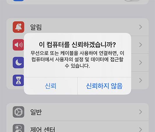 컴퓨터와 아이폰을 연결하고 아이폰에서 아래 팝업이 뜨면 '신뢰'를 눌러주세요.