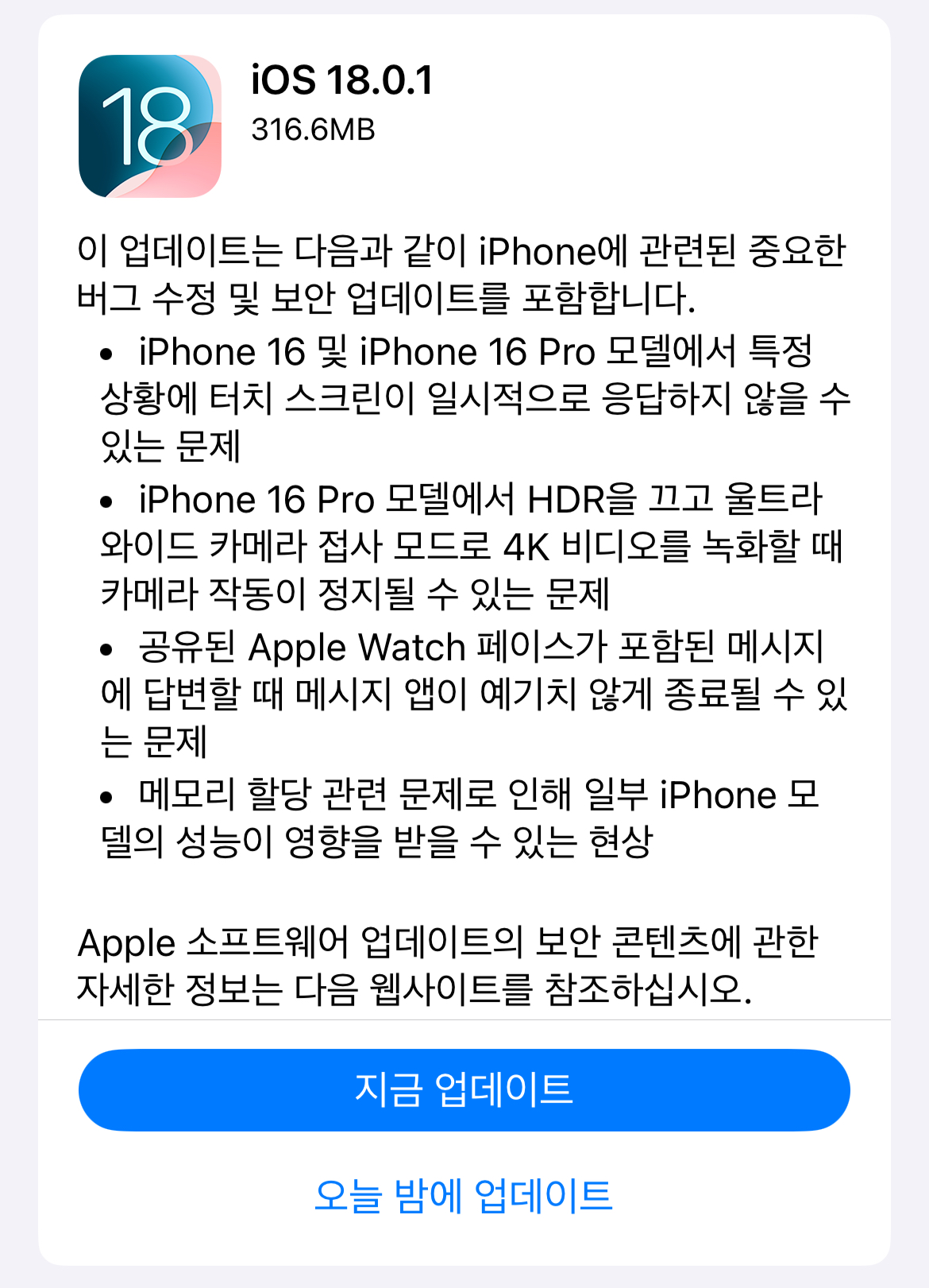 한국 시각 10월 4일 새벽에 iOS 18.0.1 마이너 업데이트가 출시되었습니다.