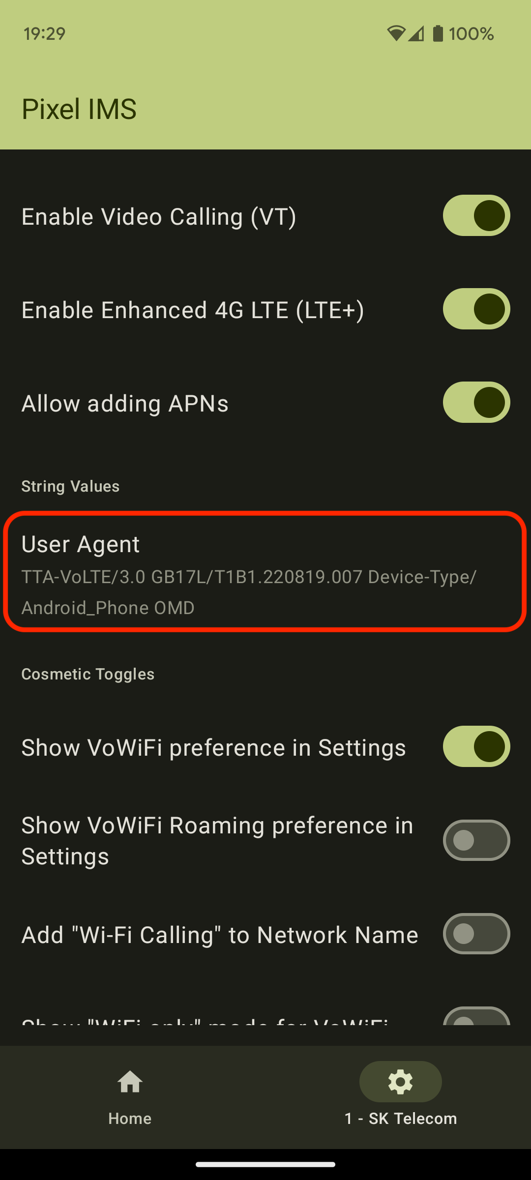 오른쪽 상단 3개 점(...) 메뉴에서 SIM1 Policy(eSim은 SIM2 Policy)를 선택하신 후, 스크롤해서 SIP_USER_AGENT 항목을 찾습니다.
