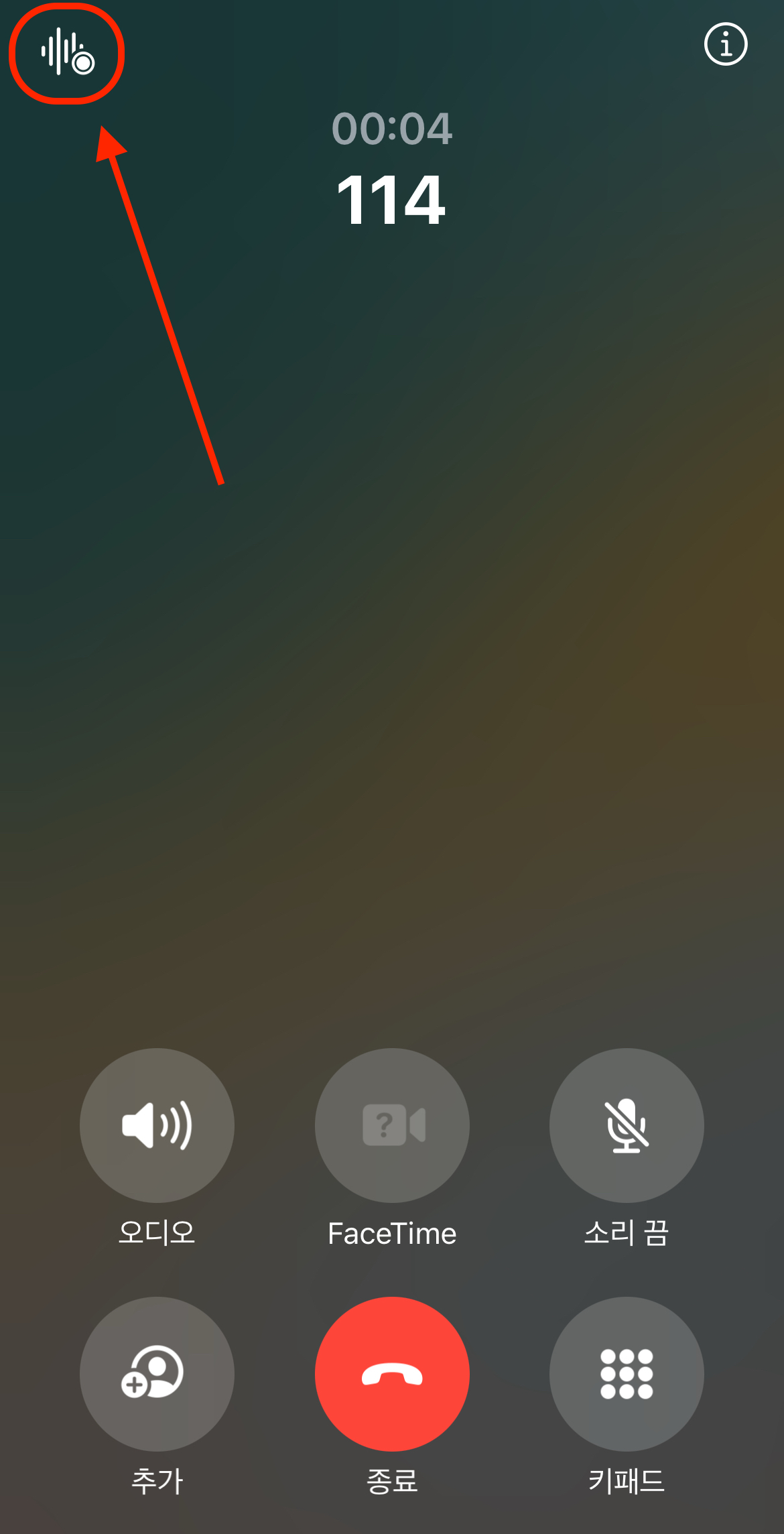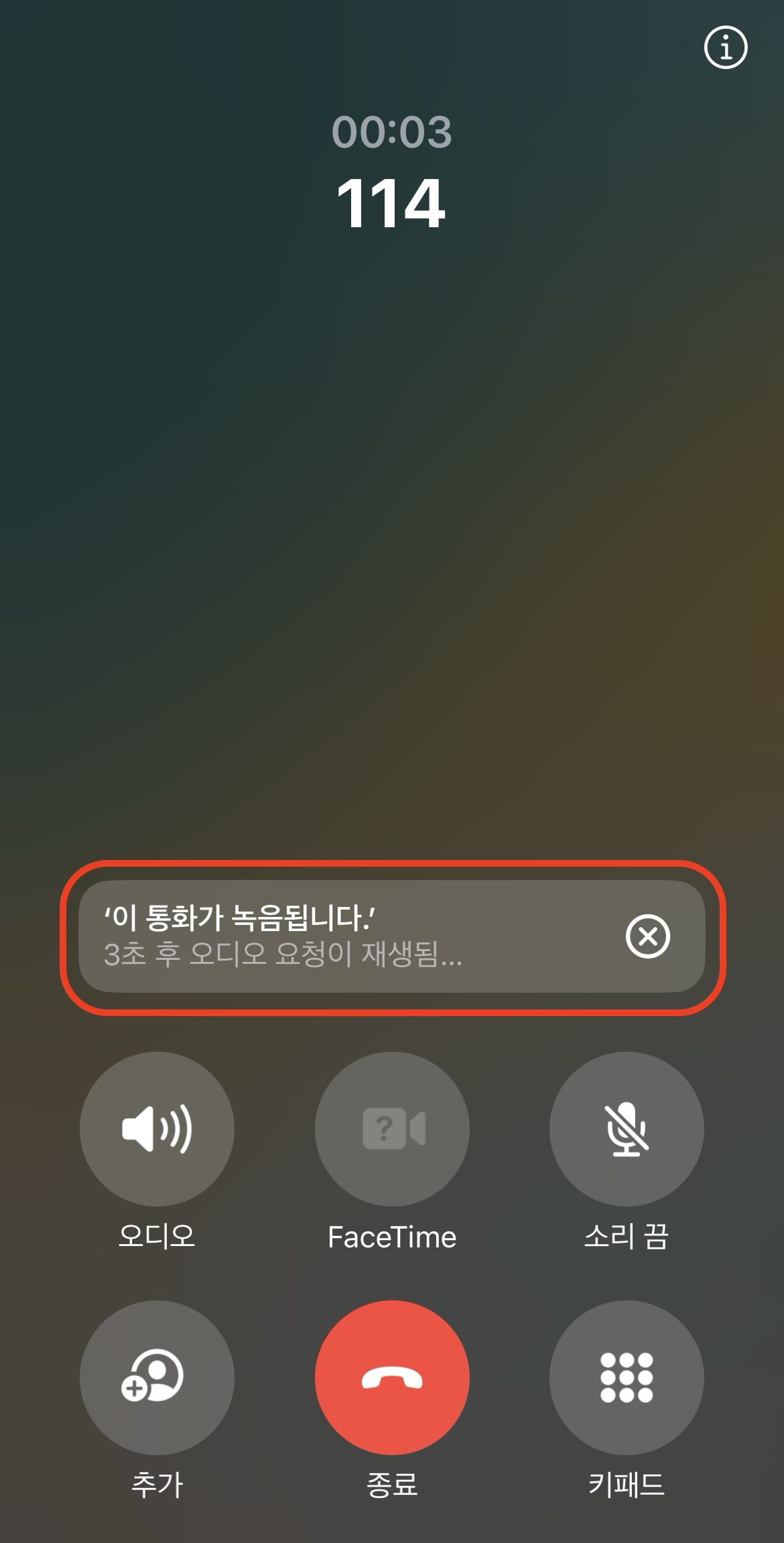 통화가 연결되면 왼쪽 위에 통화 녹음 아이콘이 활성화됩니다. 누르면 화면 가운데에 통화 녹음 배너가 뜨며, 3초 뒤 통화 녹음이 시작됩니다.