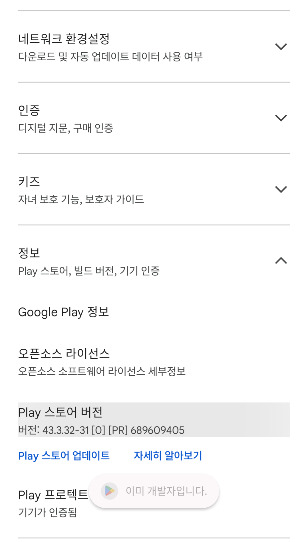 정보 탭에서 Play 스토어 버전을 여러 번 누릅니다. 안드로이드 개발자 설정처럼 토스트 메세지가 뜨며 개발자 설정이 열립니다.