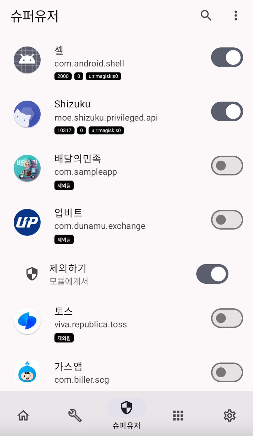 B. 이후 APatch의 슈퍼유저 탭(가장 가운데 탭)에서 루팅을 숨길 앱 (은행, 페이, 핀테크 앱 등)을 클릭해서 제외하기를 활성화합니다.