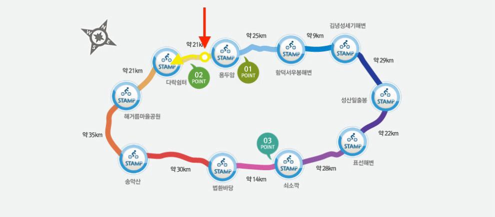 저와 같은 경로로 달린다면 위 그림에 표시한 데로 용두암에서 가까운 곳에서 출발해 다락쉼터 인증센터쪽으로 약 20km 정도를 가게 됩니다. 대부분 평지로 이루어져 있고, 옆으로 해안이 쭉 펼쳐져 있어 풍경을 마음껏 즐기며 타기 좋습니다. 단, 이쪽은 관광객이 많아 인도에 사람이 많습니다. 안전을 위해 속도를 조절해가며 자전거와 익숙해지는 시간을 가지면 됩니다.