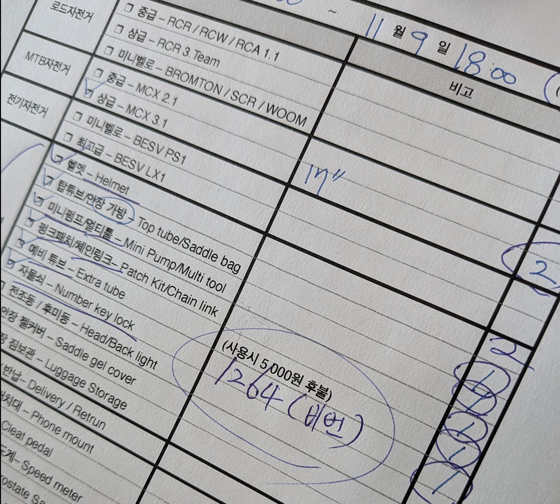 건물로 들어가면 사장님이 예약을 확인하고 준비해둔 자전거를 꺼내주신 뒤, 기본적인 조작과 주의사항에 대해 설명해 주십니다. 만약 타보고 더 추가하고 싶은 옵션이 있다면 현장에서 바로 가능하니 편하게 하시면 됩니다. 저희도 현장에서 전조등/후미등과 짐 배낭을 추가했습니다.